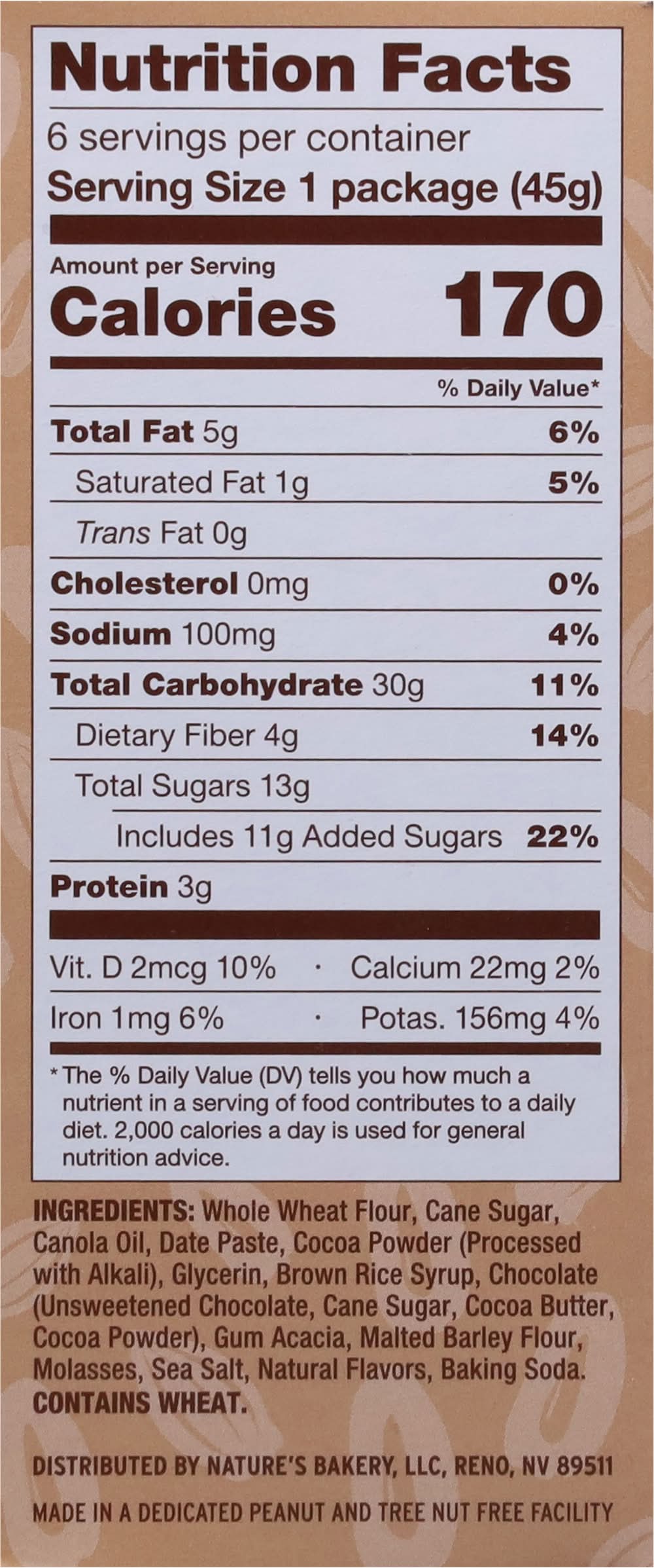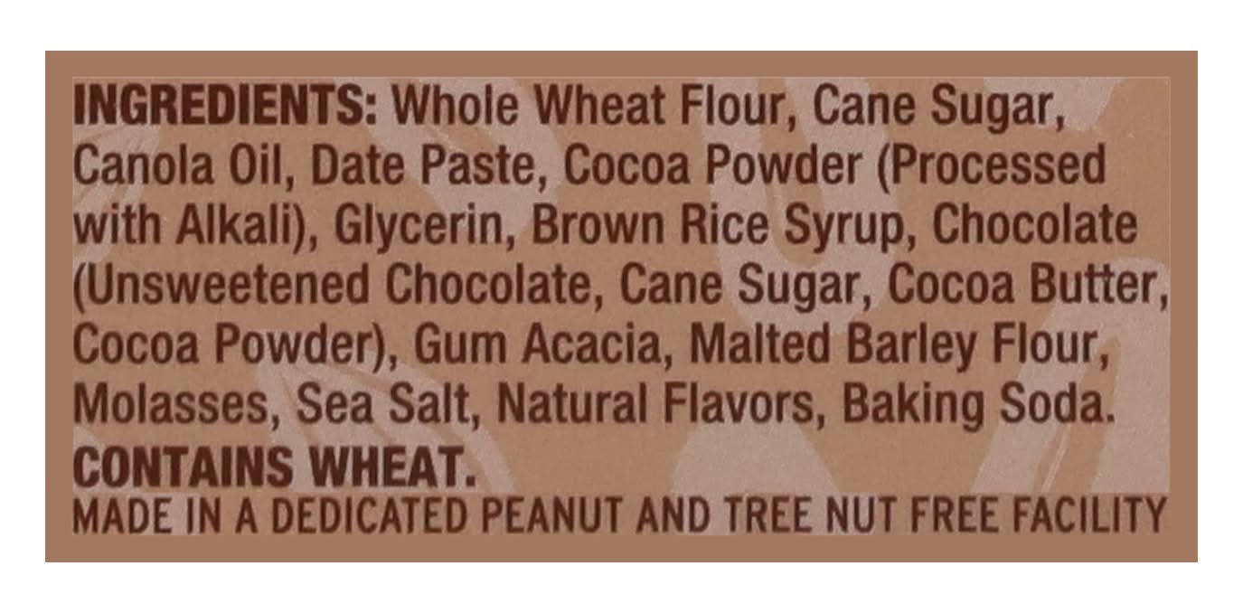 Ingredients: Whole Wheat Flour, Cane Sugar, Canola Oil, Date Paste, Cocoa Powder (Processed with Alkali), Glycerin, Brown Rice Syrup, Chocolate (Unsweetened Chocolate, Cane Sugar, Cocoa Butter, Cocoa Powder), Gum Acacia, Malted Barley Flour, Molasses, Sea Salt, Natural Flavors, Baking Soda Contains: Wheat, Barley