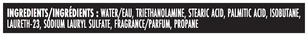 Ingredients: Water/Eau, Triethanolamine, Stearic Acid, Palmitic Acid, Isobutane, Laureth-23, Sodium Lauryl Sulfate, Fragrance, Propane