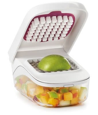 Equipped with a stainless steel blade pattern, the Oxo Good Grips Vegetable Chopper With Easy-Pour Opening simplifies the chopping process and minimizes kitchen mess. It is designed to quickly and safely chop onions, peppers, and more in one easy motion. The chopper features an easy-pour opening that allows for the transfer of chopped fruits or vegetables without removing the lid. Additionally, it includes a recessed cutting area that keeps food in place, while the lid provides leverage for efficient chopping. This kitchen tool is designed to enhance the convenience and cleanliness of food preparation tasks.