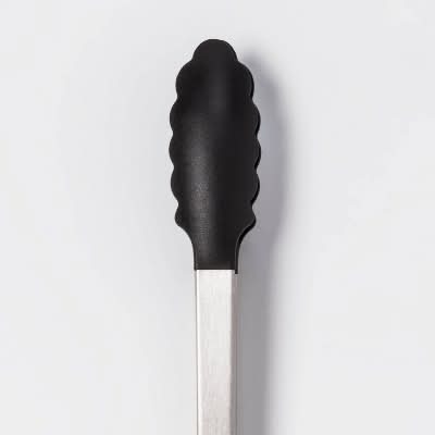 These Stainless Steel Tongs from Room Essentials are the perfect addition to your kitchen or grill accessories. The metal tongs have long arms with scalloped nylon ends designed to withstand high temperatures for gripping and lifting hot foods, protecting your hands from burns or messes. These long-armed tongs are also equipped with a convenient locking mechanism that provides the versatility to securely store them in a drawer or countertop organizer when not in use. Color: Black