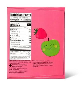 For a snack the whole family can indulge in at any time, pick up Strawberry Applesauce Pouches from Good & Gather™. This applesauce pack comes with 12 on-the-go pouches with a squeezable design, perfect for even little ones to grab. Each applesauce pouch contains 1/3 cup of apple fruit puree* in a yummy strawberry flavor, complete without any synthetic colors. Plus, the resealable cap helps in the case of any leftovers. Whether you add one to your kiddo's lunch, enjoy one as a midday treat or grab a pouch when heading out the door, these squeezable applesauce pouches are sure to satisfy snack cravings. Every product that carries the Good & Gather™ name starts with quality ingredients that deliver great taste, making it easier for you and your family to eat well, every day. We promise you’ll love each bite, or your money back. All Good & Gather products are made without artificial flavors, synthetic colors, artificial sweeteners, and high-fructose corn syrup. Some are specially formulated while others never contained these ingredients.