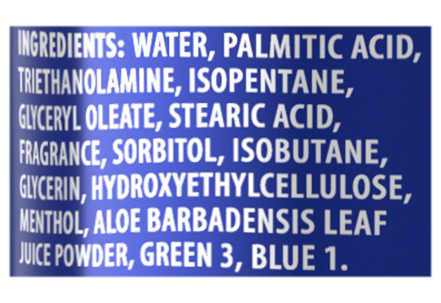 Ingredients: Water, Palmitic Acid, Triethanolamine, Isopentane, Glyceryl Oleate, Stearic Acid, Fragrance, Sorbitol, Isobutane, Glycerin, Hydroxyethylcellulose, Menthol, Aloe Barbadensis Leaf Juice Powder, Green 3, Blue 1