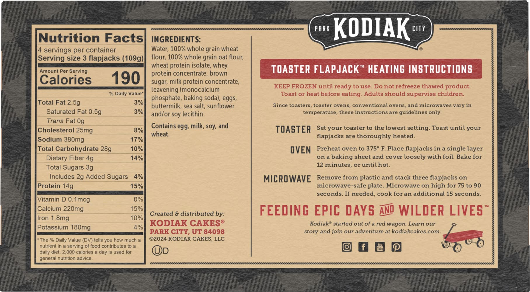 Kodiak Buttermilk Power Flapjacks are made for those who want more from their breakfast. These frozen flapjacks are crafted with 100% whole grains and rich homestyle buttermilk, delivering 14 grams of protein per serving to keep you energized and satisfied. Perfectly designed for toasting, baking, or microwaving, they provide a warm, hearty meal that's ready in minutes. Whether you're navigating a busy morning or enjoying a cozy weekend brunch, Kodiak flapjacks are a convenient and delicious way to fuel your day. Keep them frozen until you're ready to enjoy a wholesome breakfast or protein snack. • Flavor: Buttermilk • Kodiak Cakes, Park City, UT, 84098 • Packaging: Reusable