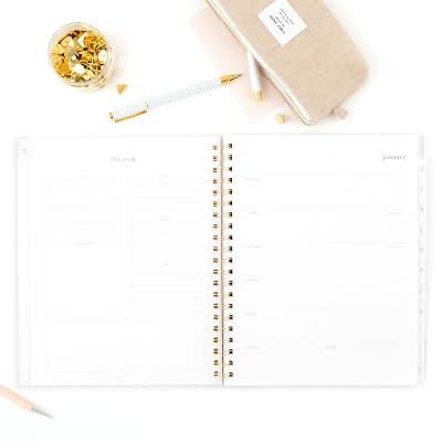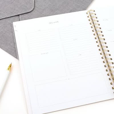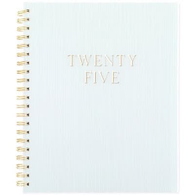Stay organized and keep track of goals, important dates, and more with a planner from Sugar Paper Essentials exclusively for Target. The weekly spread has open planning space for each day on the right side and lists on the left side. Tabbed monthly spreads have unruled daily blocks and sections for personal, health, work and financial goals, plus important dates. Expand your organizational skills with extra pages that include stickers, a holiday list, notes page, bucket list, 2-page reference calendar and storage pocket. Planner has a durable poly Dusty Blue Stripe cover with a gold twin wire spiral binding. • Color: Frosted dusty blue • Size: 9.5 In x 11 In