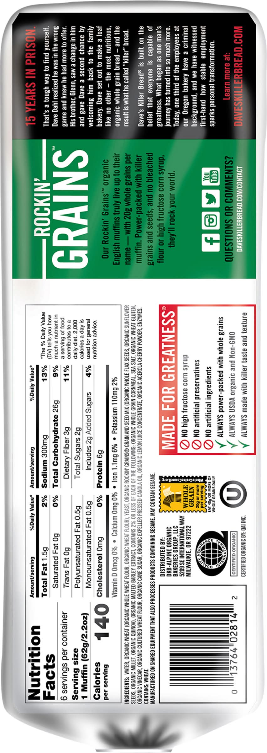 Dave's Killer Bread® Rockin' Grains® English Muffins are amped up with killer grains and seeds to rock your world! Each USDA organic English muffin includes 20g of whole grains and features butter-catching flavor craters to create an out-of-this-world breakfast experience. These tasty, Non-GMO Project Verified English muffins are baked with five killer organic grains and seeds, including flax seeds, sunflower seeds, sesame seeds, millet and quinoa. Plus, they have no high-fructose corn syrup, no artificial flavors, no artificial ingredients and no bleached flour. You can trust Dave's Killer Bread® to deliver killer taste, texture and whole grain nutrition. Rockin' Grains® English muffins are pre-sliced and just what you need for excellent eggs benedict, hearty breakfast sandwiches or buttery English muffins on the go. The story of Dave’s Killer Bread® began at the Portland Farmers Market, when Dave Dahl and his nephew brought some loaves of Dave's bread to sell. For Dave, this marked the beginning of a new chapter in his life. Though he grew up in a family of bakers, his life took a different path. A path that landed him in prison for 15 years. Determined to prove his worth and make a positive impact, Dave worked tirelessly to bake breads that tasted unlike anything else on the market — packed with seeds and grains, made with only the very best organic and Non-GMO Project Verified ingredients. Dave’s Killer Bread® believes everyone is capable of greatness. One in three of the company's employee partners at their Milwaukie, OR bakery has a criminal background—but your past doesn't define your future. As a proud Second Chance Employer, Dave’s Killer Bread® truly believes everyone deserves a second chance to become a Good Seed. DKB-Alpine Organic Bakeries Group, Llc, Milwaukee, OR, 97222