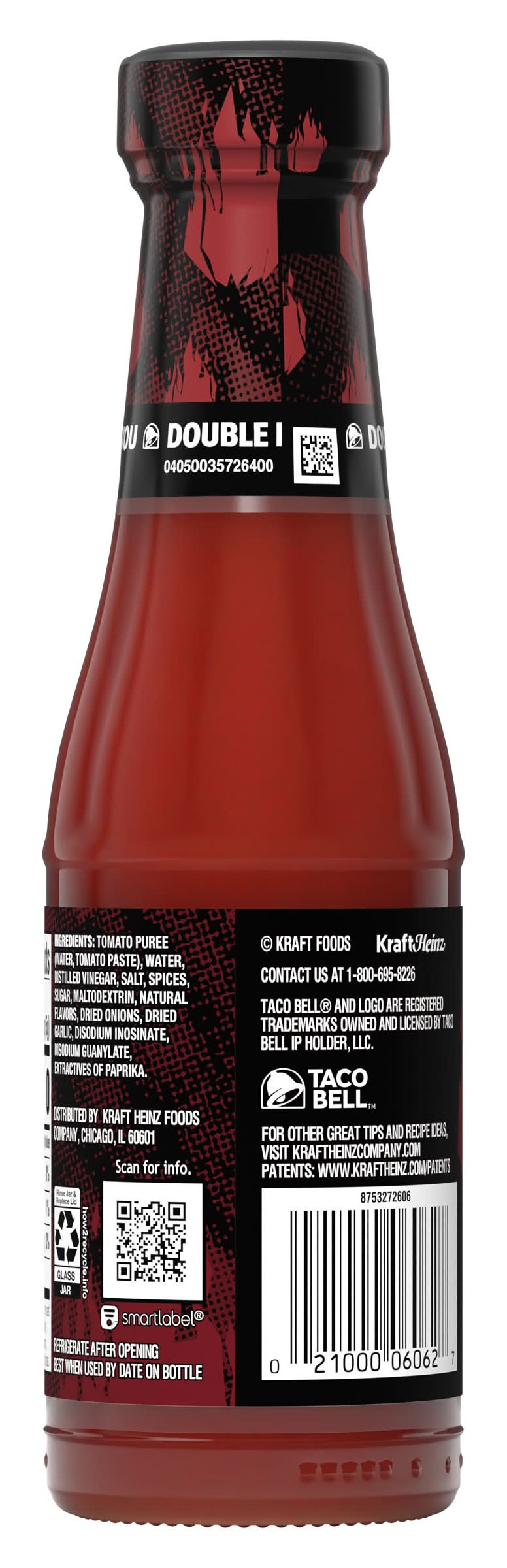 Live más at home with our Taco Bell Diablo Sauce. Taco Bell makes mealtime more craveable with our hot taco sauce made with tomato puree, onion powder, dehydrated garlic and extractives of paprika. Diablo hot sauce adds a seriously spicy kick to dishes. Pour our taco sauce on tacos, burritos, quesadillas and nachos or use as an ingredient for Mexican-style recipes. The convenient bottle allows for easy serving, cleanup and storage. Each 7.5-ounce bottle contains about 43 servings. Live more fervently, more authentically, more joyfully with Taco Bell.