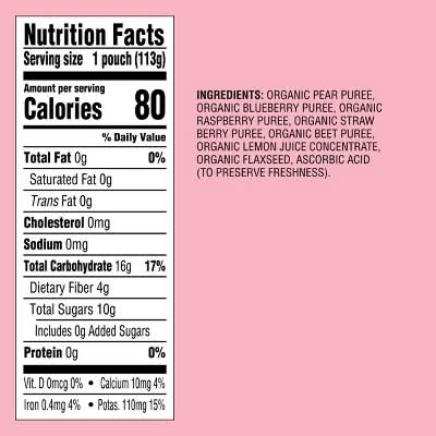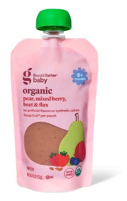 Your baby will love the delicious fruity flavor of this Organic Pear Mixed Berry Beet Flax Baby Food Pouch from Good & Gather™. Made with organic pear, strawberry, blueberry, raspberry, beet and flax, this snack pouch features no artificial colors or artificial flavors. Each 4-ounce pouch contains 3/4 cup fruit and 4 grams of fiber. These fruity baby food pouches are recommended for ages 8 months and up, for babies who are starting to pick food up with their fingers and bite into foods. 8+ months: Your baby may be ready for this food when they: • Crawl with tummy off the floor. • Begin to mash food between gums using jaws. • Start to bite into foods. • Begin to pick up food to eat with fingers. • Have tried a variety of foods. Every product that carries the Good & Gather™ name starts with quality ingredients that deliver great taste, making it easier for you and your family to eat well every day. We promise you’ll love each bite or your money back.