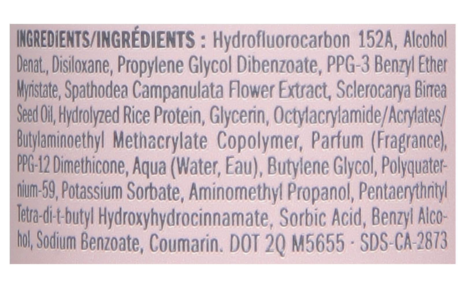 Ingredients: Hydrofluorocarbon 152a, Alcohol Denat, Disiloxane, Propylene Glycol Dibenzoate, PPG-3 Benzyl Ether Myristate, Spathodea Campanulata Flower Extract, Sclerocarya Birrea Seed Oil, Hydrolyzed Rice Protein, Glycerin, Octylacrylamide/Acrylates/Butylaminoethyl Methacrylate Copolymer, Parfum (Fragrance), PPG-12 Dimethicone, Aqua (Water, Eau), Butylene Glycol, Polyquaternium-59, Potassium Sorbate, Aminomethyl Propanol, Pentaerythrityl Tetra-Di-T-Butyl Hydroxyhydrocinnamate, Sorbic Acid, Benzyl Alcohol, Sodium Benzoate, Coumarin