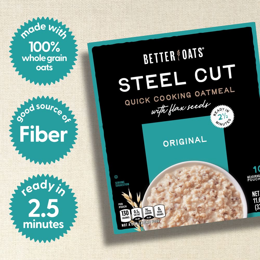 Feel good about what you feed your family in the mornings with Better Oats Original Steel Cut Oatmeal Packets with Flax Seeds. These 10 Original flavor instant oatmeal pouches contain a high quality blend of steel cut oats and flax seeds that deliver a delicious hot oatmeal taste with every spoonful. The steel cut oats in this instant oatmeal are cut with hardened steel to create a thick, hearty texture in your morning breakfast oatmeal. Each steel cut oatmeal packet cooks in 2.5 minutes.