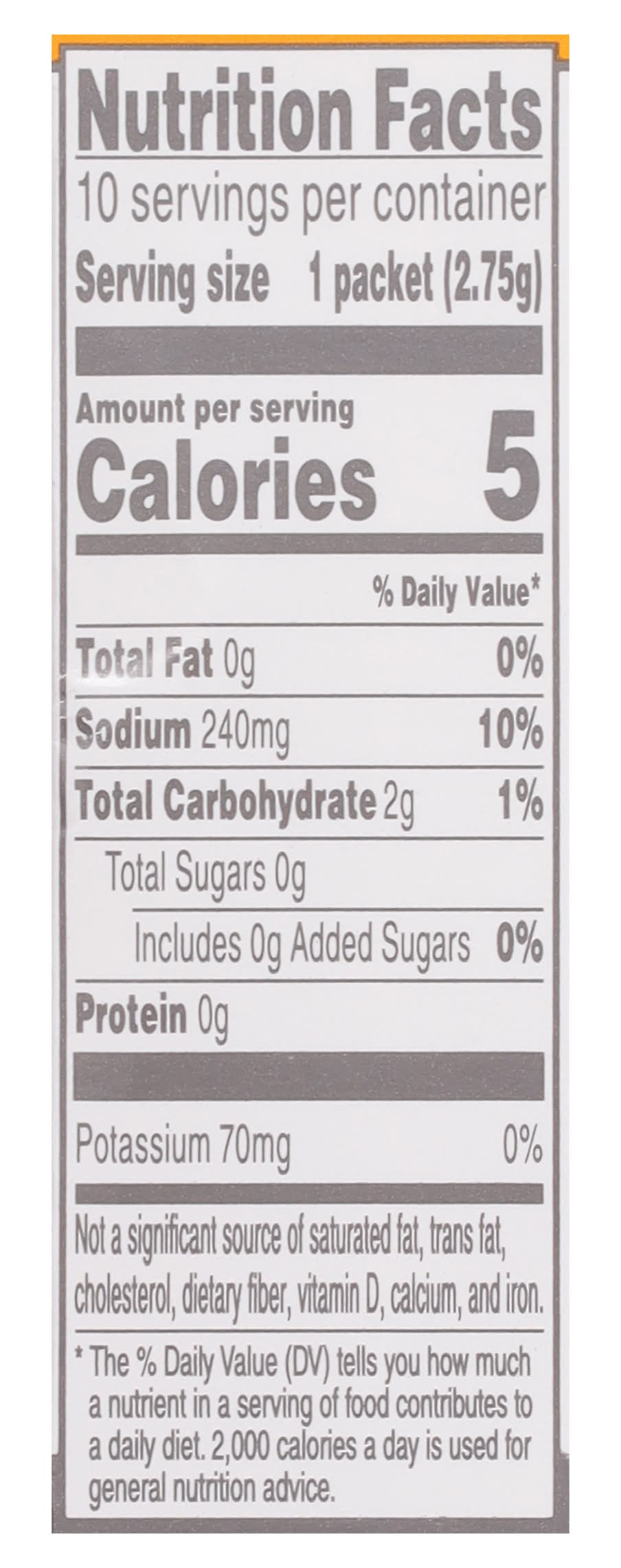 Ingredients: Citric Acid, Sodium Citrate, Salt, Monopotassium Phosphate, Modified Food Starch, Maltodextrin, Sucralose, Natural Flavor, Silicon Dioxide, Acesulfame Potassium, Yellow 6, Tocopherols (to Protect Flavor)