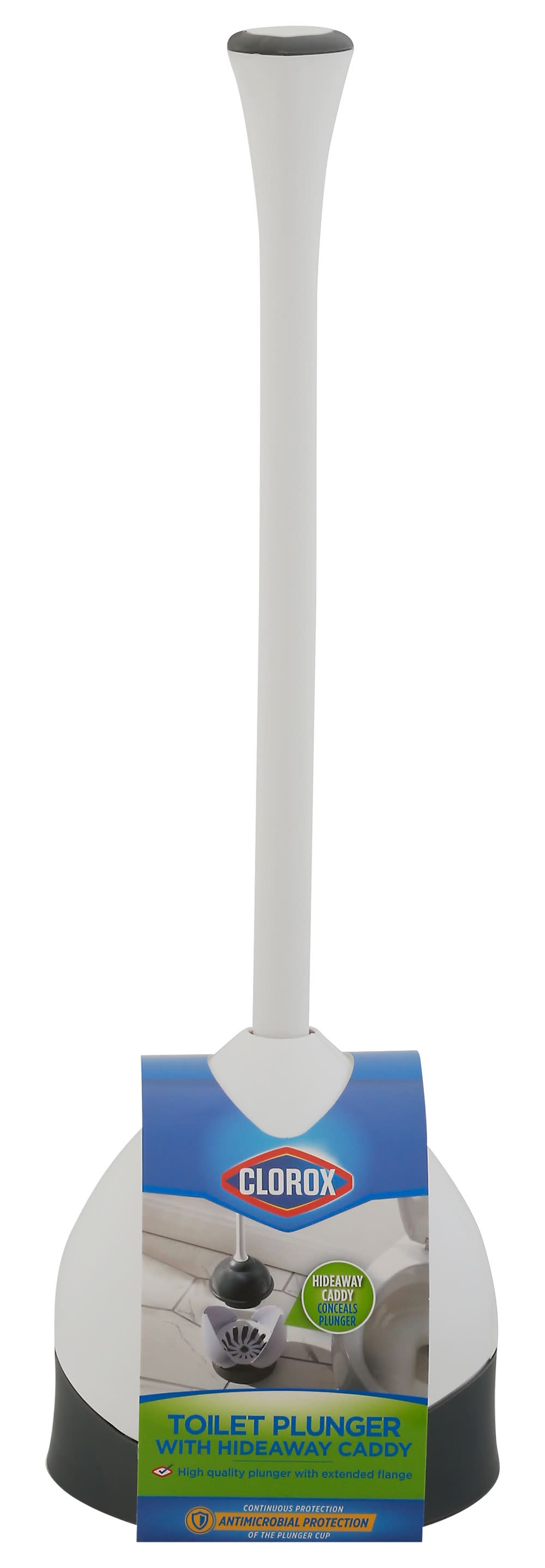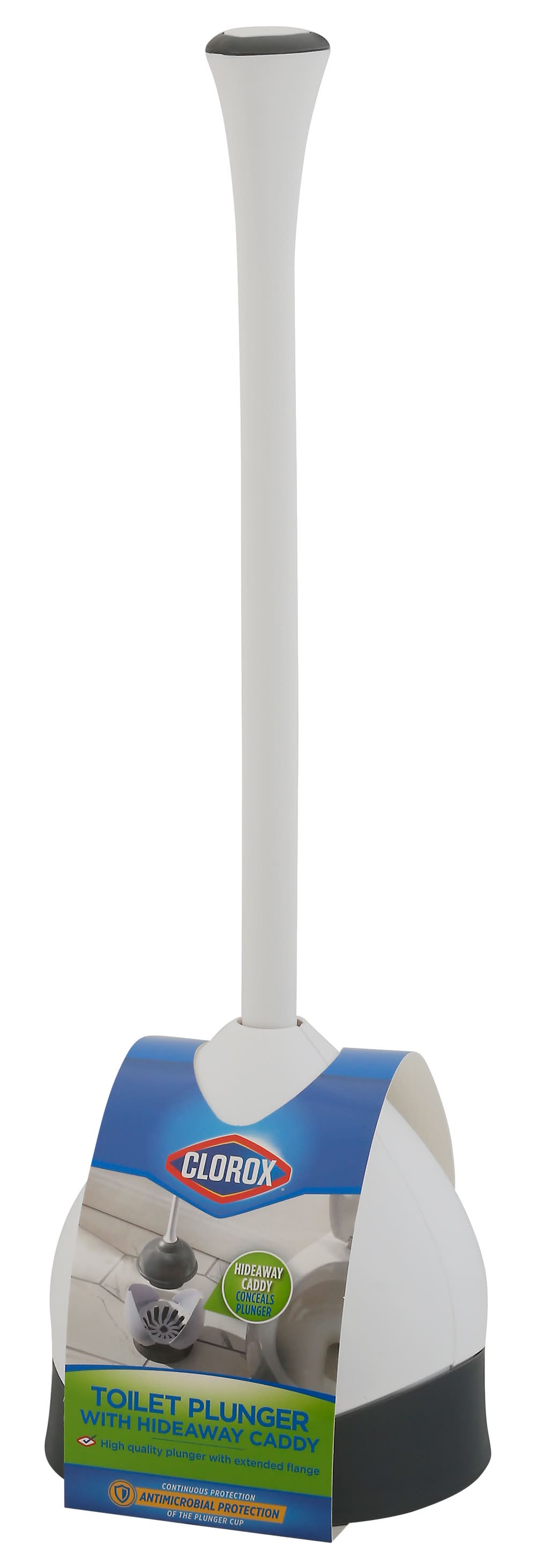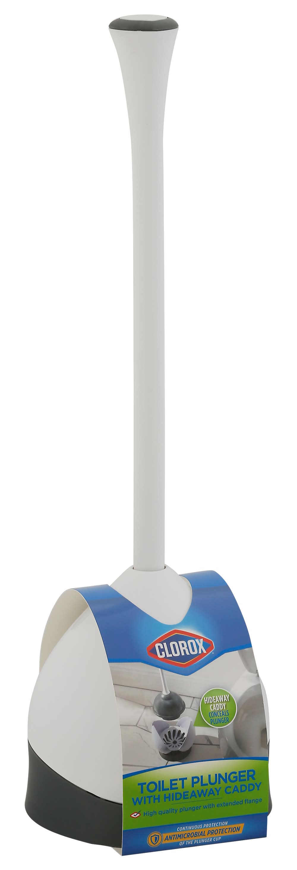 Hideaway caddy conceals plunger. High quality plunger with extended flange. Continuous protection. Antimicrobial protection of the plunger cup. Clorox cleaning tools have antimicrobial protection against odor causing bacteria. The antimicrobial material is built into the plunger cup, providing continuous protection that won't wash off or wear away. • Color: White-black • Packaging: Reusable