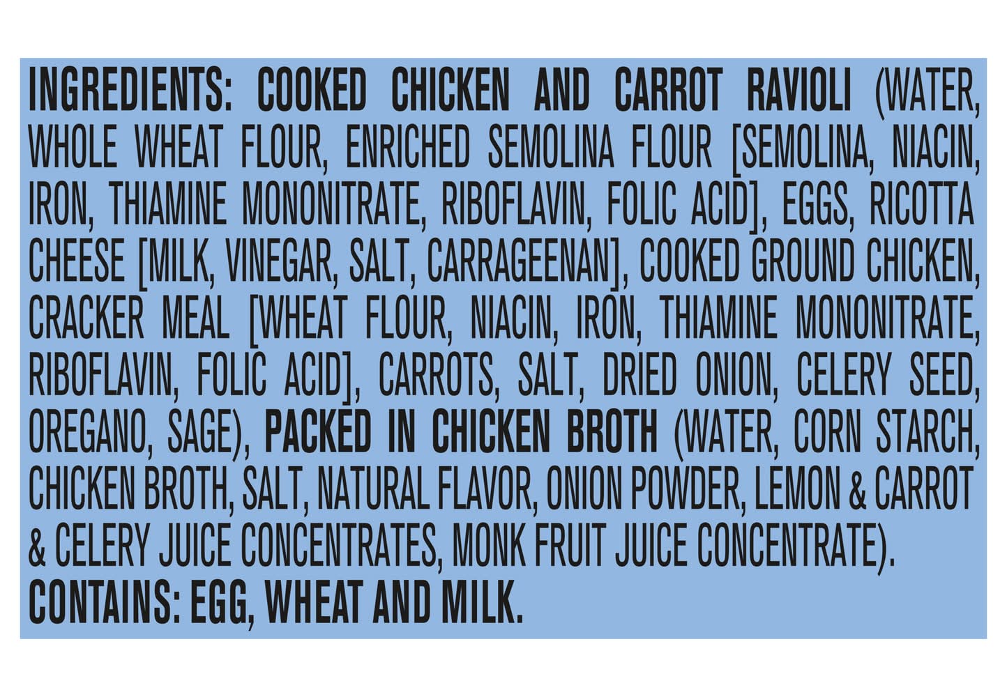 Ingredients: Cooked Chicken and Carrot Ravioli (Water, Whole Wheat Flour, Enriched Semolina Flour [Semolina, Niacin, Iron, Thiamine Mononitrate, Riboflavin, Folic Acid], Eggs, Ricotta Cheese [Milk, Vinegar, Salt, Carrageenan], Cooked Ground Chicken, Cracker Meal [Wheat Flour, Niacin, Iron, Thiamine Mononitrate, Riboflavin, Folic Acid], Carrots, Salt, Dried Onion, Celery Seed, Oregano, Sage), Packed in Chicken Broth (Water, Corn Starch, Chicken Broth, Salt, Natural Flavor, Onion Powder, Lemon & Carrot & Celery Juice Concentrates, Monk Fruit Juice Concentrate) Contains: Eggs, Wheat, Milk, Celery