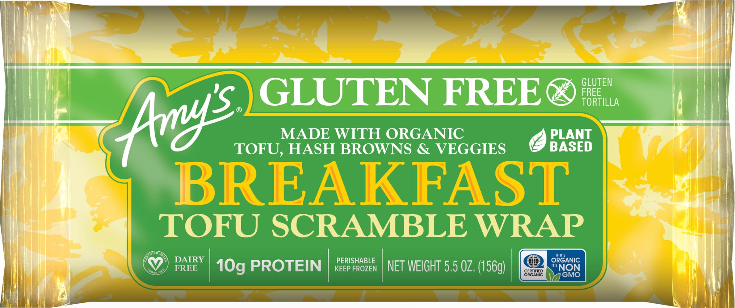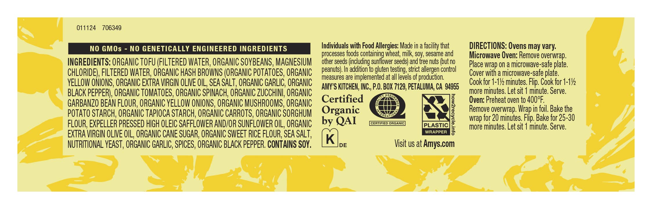 It s breakfast. It s a snack. No matter what you call it, this wrap is filled with savory organic tofu, hash browns and a mix of yummy veggies that can be enjoyed just about any time. Since 1987, we at Amy s Kitchen have produced delicious, convenient foods for people who are sometimes too busy to cook. Amy s is a family-run business, and we supervise every aspect of our business and take pride in customer satisfaction. All the fruits, vegetables and grains we use are grown without the use of insecticides, GMOs and other harmful chemicals. We prepare these ingredients with the same careful attention in our kitchen as you would in your own home for high-quality, home-style vegetarian and vegan meals. No meat, fish, shellfish, poultry, eggs or peanuts are ever used in any Amy's products. Even though you're heating up our meals in your home, we want each bite to taste like you're a guest in ours. Number of servings: 1