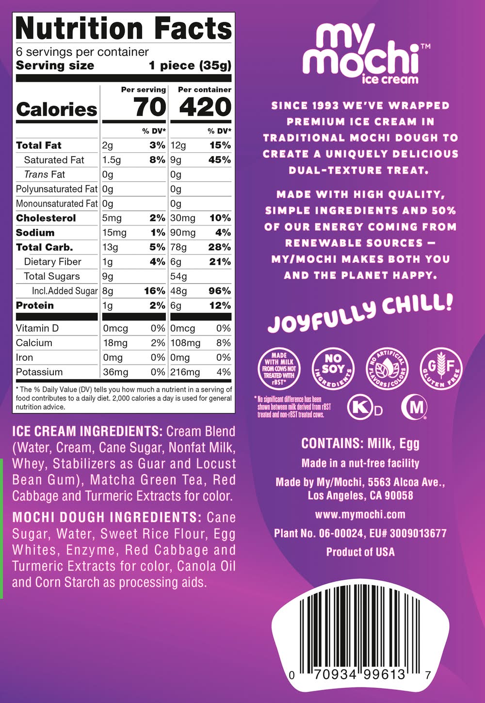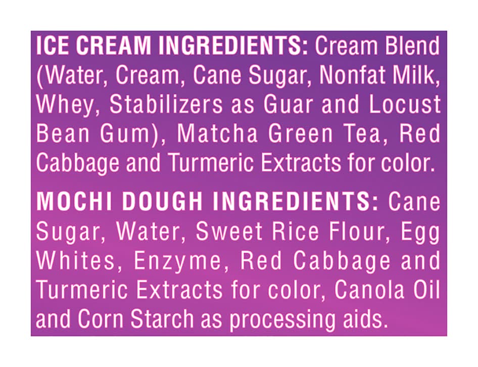 Ingredients: Ice Cream Ingredients: Cream Blend (Water, Cream, Cane Sugar, Nonfat Milk, Whey, Stabilizers as Guar and Locust Bean Gum), Matcha Green Tea, Red Cabbage and Turmeric Extracts for Color. Mochi Dough Ingredients: Cane Sugar, Water, Sweet Rice Flour, Egg Whites, Enzyme, Red Cabbage and Turmeric Extracts for Color, Canola Oil and Corn Starch as Processing Aids Contains: Milk, Eggs, Corn