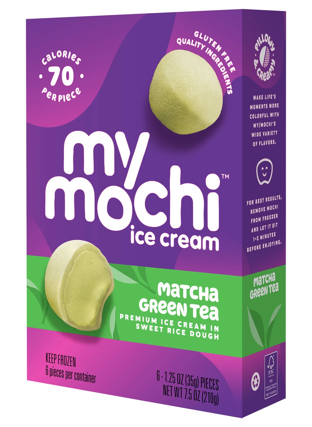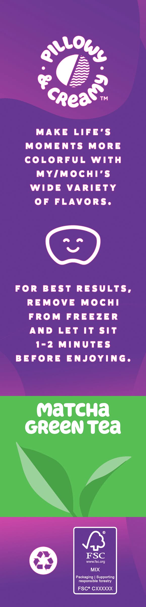 Pillowy & Creamy Made with milk from cows not treated with rBST* *No significant difference has been shown between milk derived from rBST treated and non-rBST treated cows. • Flavor: Matcha green tea • Pack size: 6 • Packaging: Reusable