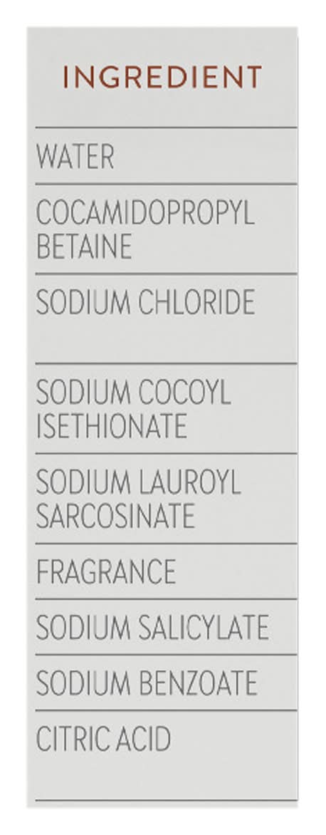 Ingredients: Water, Cocamidopropyl Betaine, Sodium Chloride, Sodium Cocoyl Isethionate, Sodium Lauroyl Sarcosinate, Fragrance, Sodium Salicylate, Sodium Benzoate, Citric Acid
