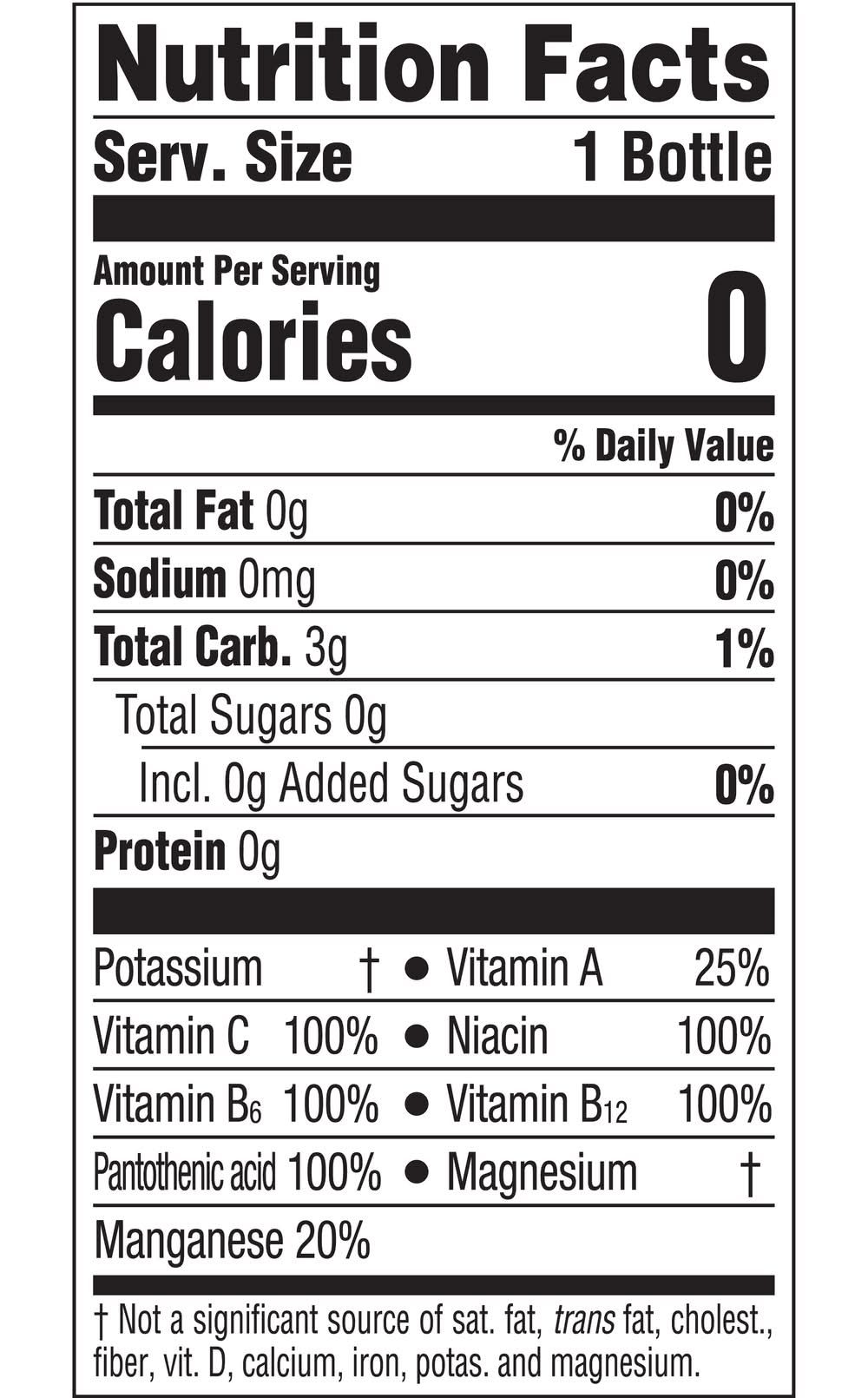 Ingredients: Reverse Osmosis Water, Erythritol, Less Than 0.5% Of: Vitamins C, A, B3, B5, B6, And B12 (Ascorbic Acid, Beta Carotene, Niacinamide, Calcium Pantothenate, Pyridoxine Hydrochloride, And Cyanocobalamin), Electrolytes (Calcium And Magnesium Lactates And Potassium Phosphate), Manganese Citrate, Fruit And Vegetable Juices (Color), Citric Acid, Gum Acacia, Natural Flavors, Stevia Leaf Extract.