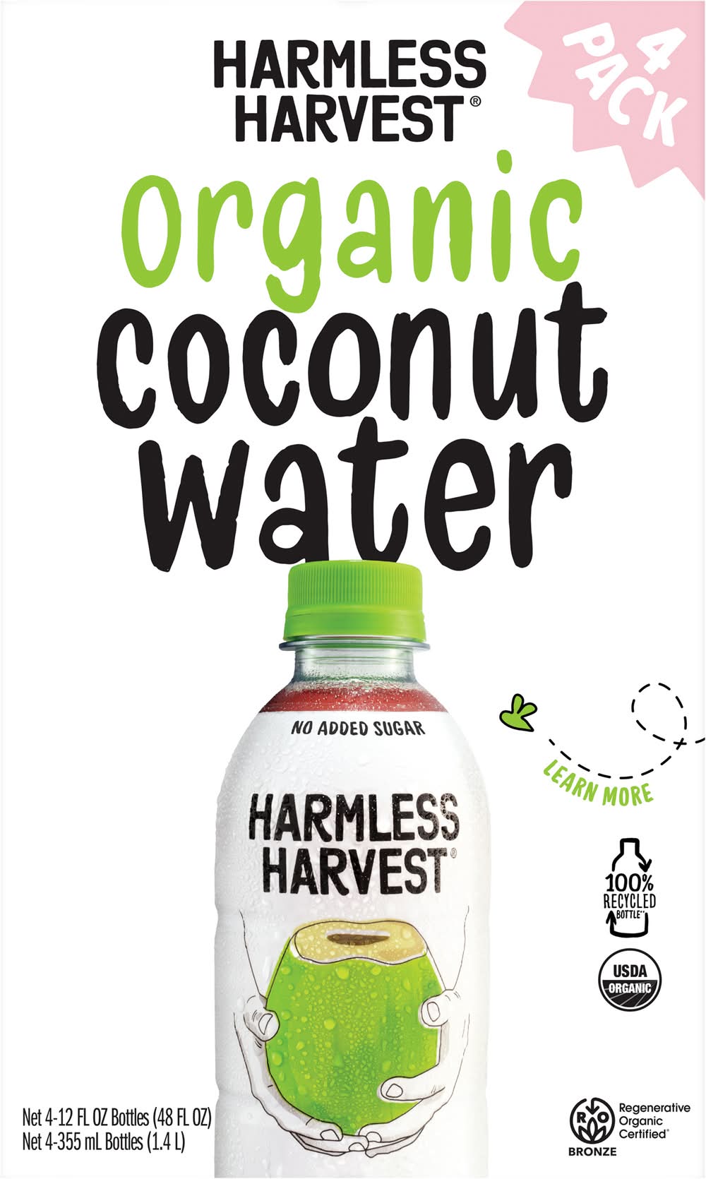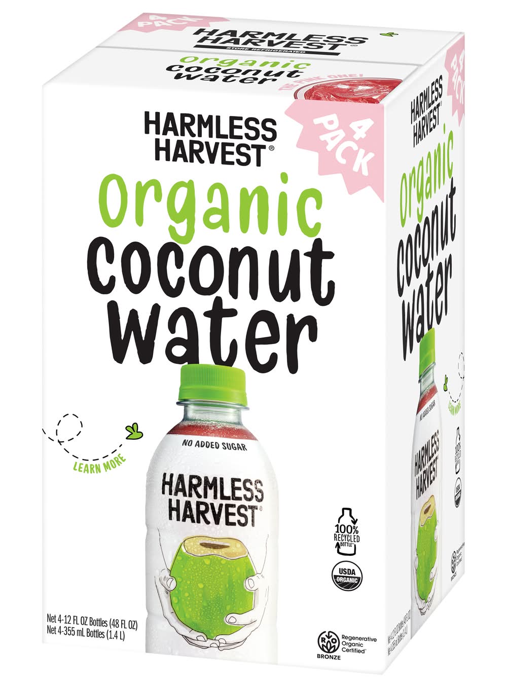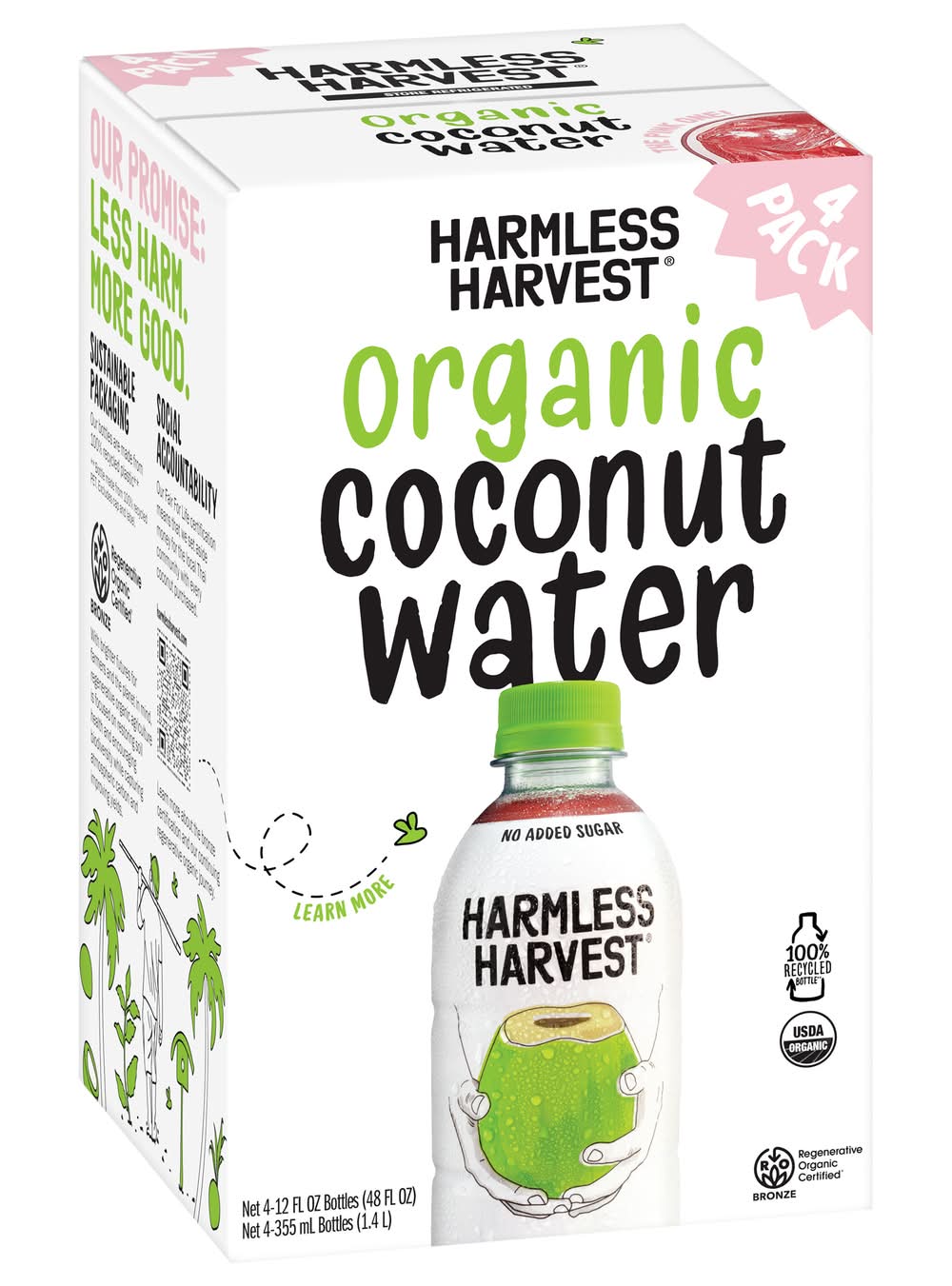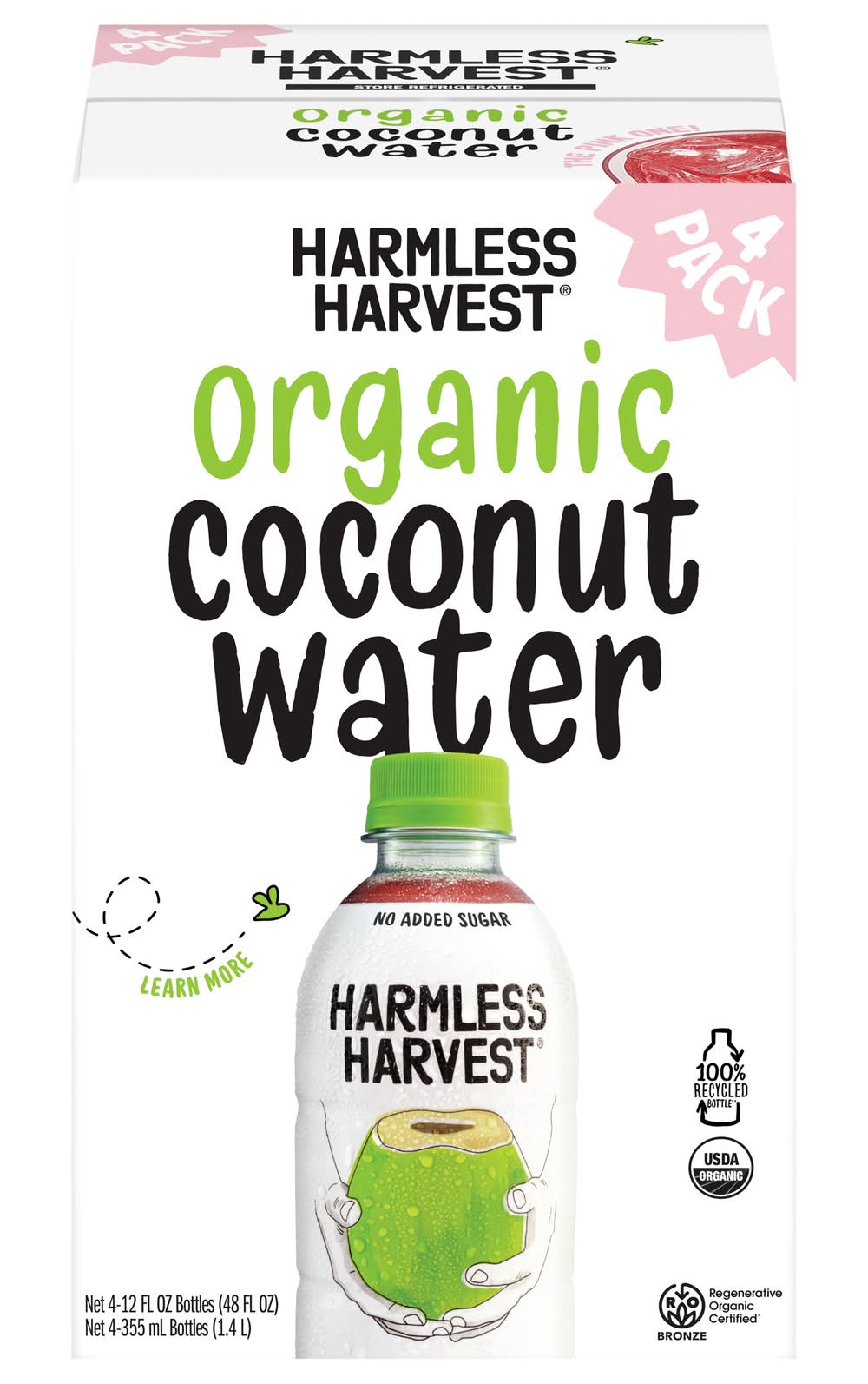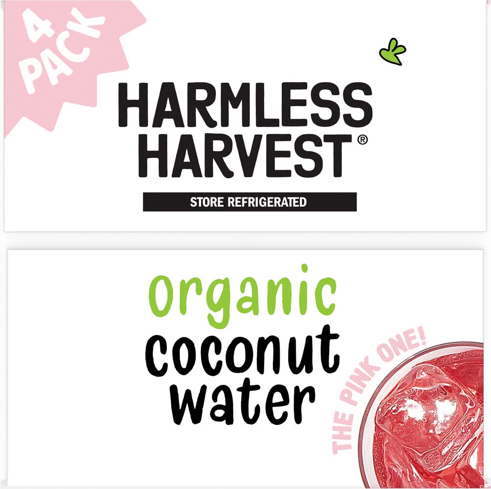 Harmless Harvest Organic Coconut Water, made from Nam Hom coconuts, delivers delicious natural hydration in every sip. Whether you're mid-hike, post hot yoga, running errands, or recovering the morning after a big night, its naturally sweet, crisp taste always refreshes. The signature pink coconut water hue comes from a microfiltration process that preserves the natural goodness of organic coconut water, never thermally pasteurized or altered with added ingredients. With naturally occurring phosphorus and potassium, this 100% coconut water organic option helps support hydration as nature intended. Harmless Harvest offers pure coconut water from the finest Nam Hom coconuts, delivering delicious, straight-from-the-coconut refreshment in every bottle. Committed to making the best coconut water in the most ethical way possible, Harmless Harvest coconut water is Fair for Life certified, ensuring ethical sourcing practices that support farming communities and promote environmental responsibility in every step of the process. • Pack size: 4 • Harmless Harvest, Inc., San Francisco,CA,94111 • Packaging: Reusable