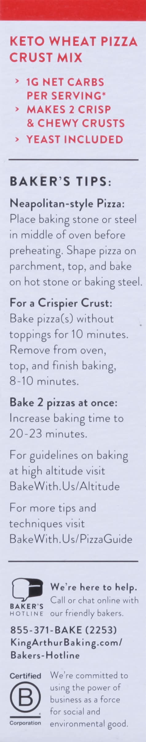 Directions: keto wheat pizza crust: makes two 12 inch pizza crusts. you’ll need - 12 inch pizza crust: yeast (packet included): 1; (1/2 packet); 2 (full packet). 12 inch pizza crusts: (lukewarm water): 1; (3/4 cup); 2 (1 1/2 cups). 12 inch pizza crusts: (olive oil): 1; (2 tablespoons); 2; (4 tablespoons). 12 inch pizza crusts.: (mix: 1; (1 1/3 cups); 2: (full bag). directions: 1. combine yeast, water, oil, and mix in a medium bowl. stir then knead (b hand or a mixer with a dough hook) until the dough is bouncy and firm, about 2 minutes. cover and let rise until puffy, about 1 hour. 2. preheat oven to 475 degrees f. grease a baking sheet or 12 inch pizza pan with olive oil. divide dough in half (use two pans if making two pizzas). transfer dough to prepared pan(s) and turn to coat with oil. 3. press dough into 12 inch circle. cover and let rest for 10 minutes, then press to 12 inch again if the dough has become smaller in diameter. top with sauce, cheese, and additional toppings as desired. 4. bake pizza(s) until cheese is bubbling and crust is browned, 15-18 minutes. baker's tips: neapolitan-style pizza: place baking stone or steel in middle of oven before preheating. shape pizza on parchment, top, and bake on hot stone or baking steel. for a crispier crust: bake pizza(s) without toppings for 10 minutes. remove from oven, top, and finish baking, 8-10 minutes. bake 2 pizzas at once: increase baking time to 20-23 minutes. for guidelines on baking at hight altitude visit bakewith.us/altitude.