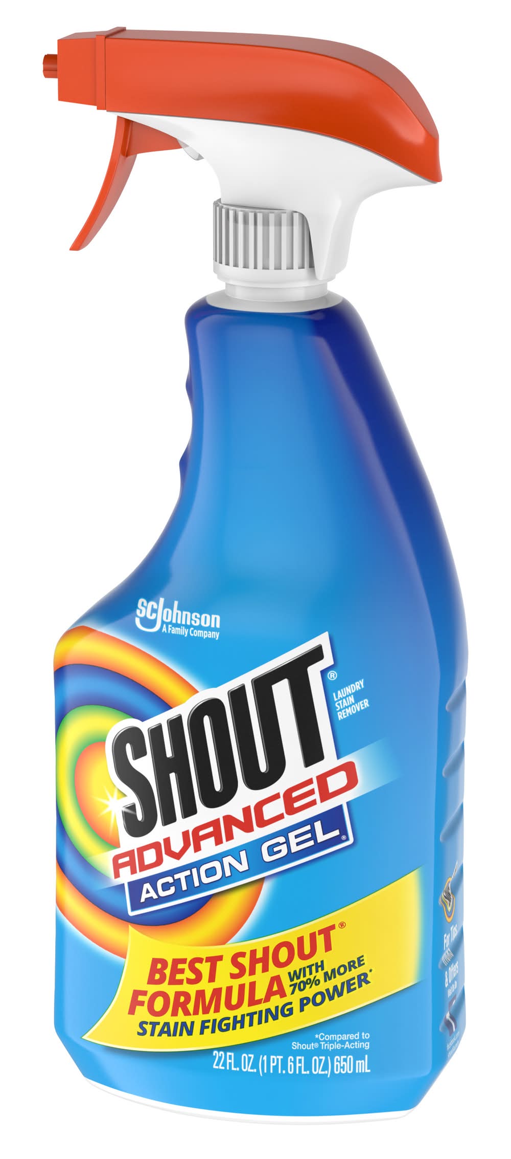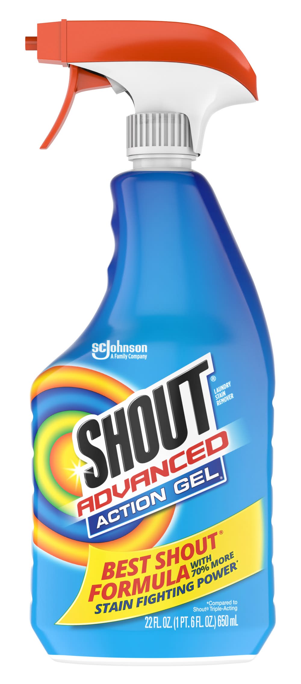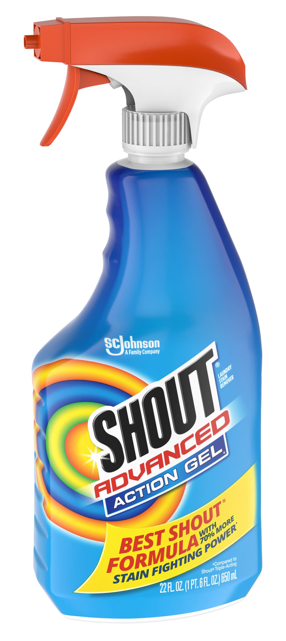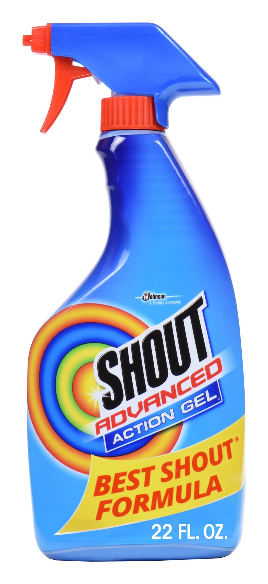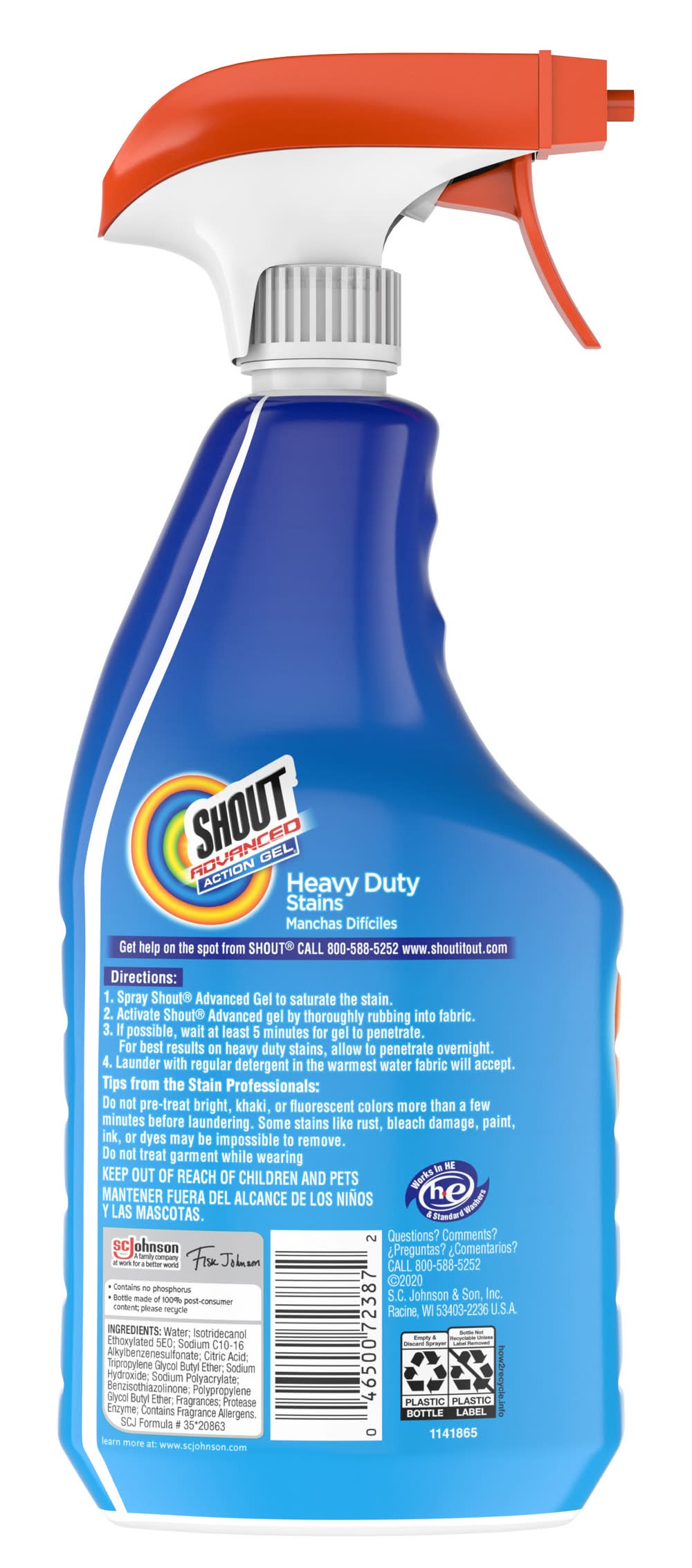 Shout Advanced Acting Gel, Laundry Stain Remover is tough on stains, but gentle on your color-fast machine-washable fabrics. It has 70% more stain-fighting power compared to Shout Triple-Acting. This super-concentrated thick gel is made specifically to tackle stubborn set-in stains like wine, blood, and makeup. Safe for all colorfast washables and works in all water temperatures. Shout has the stain-fighting ingredients to break up and remove tough stains so you can live in the moment, and clean up later. DIRECTIONS FOR USE: Spray Shout Advanced Action Gel on the stain until saturated. Activate Shout Advanced Action Gel by thoroughly rubbing into fabric. If possible, wait at least 5 minutes for gel to penetrate before laundering. For best results on heavy duty stains, allow the gel to penetrate overnight. Launder with regular detergent in the warmest water fabric will accept. WARNINGS: Keep out of reach of children and pets. INGREDIENTS: Water, Ethoxylated Alcohol, Sodium Dodecylbenzenesulphonate, Citric Acid, Sodium Hydroxide, Polyacrylate Polymer, PPG-3 Butyl Ether, Acrylic Copolymer, Benzothiazolinone, Subtilisin, Fragrance. SCJ Formula 35*20863. • S.C. Johnson & Son, Inc., Racine,WI,53403-2236 • Packaging: Reusable