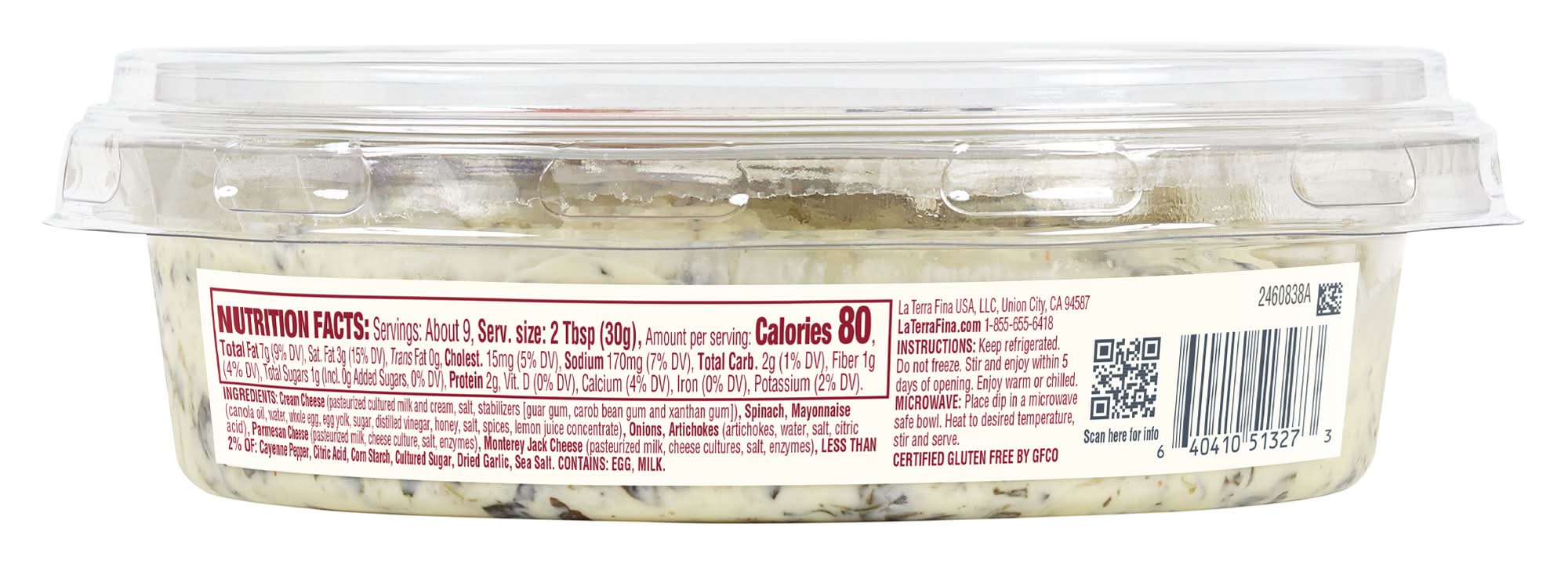 Ingredients: Cream Cheese (pasteurized cultured milk and cream, salt, stabilizers [guar gum, carob bean gum and xanthan gum]), Spinach, Mayonnaise (canola oil, water, whole egg, egg yolk, sugar, distilled vinegar, honey, salt, spices, lemon juice concentrate), Onion, Artichokes (artichokes, water, salt, citric acid), Parmesan Cheese (pasteurized milk, cheese culture, salt, enzymes), Monterey Jack Cheese (pasteurized milk, cheese cultures, salt, enzymes), Less than 2% of: Dried Garlic, Cayenne Pepper, Sea Salt, Corn Starch, Cultured Sugar, Citric Acid. ​ CONTAINS EGG, MILK. Contains: Milk, Eggs