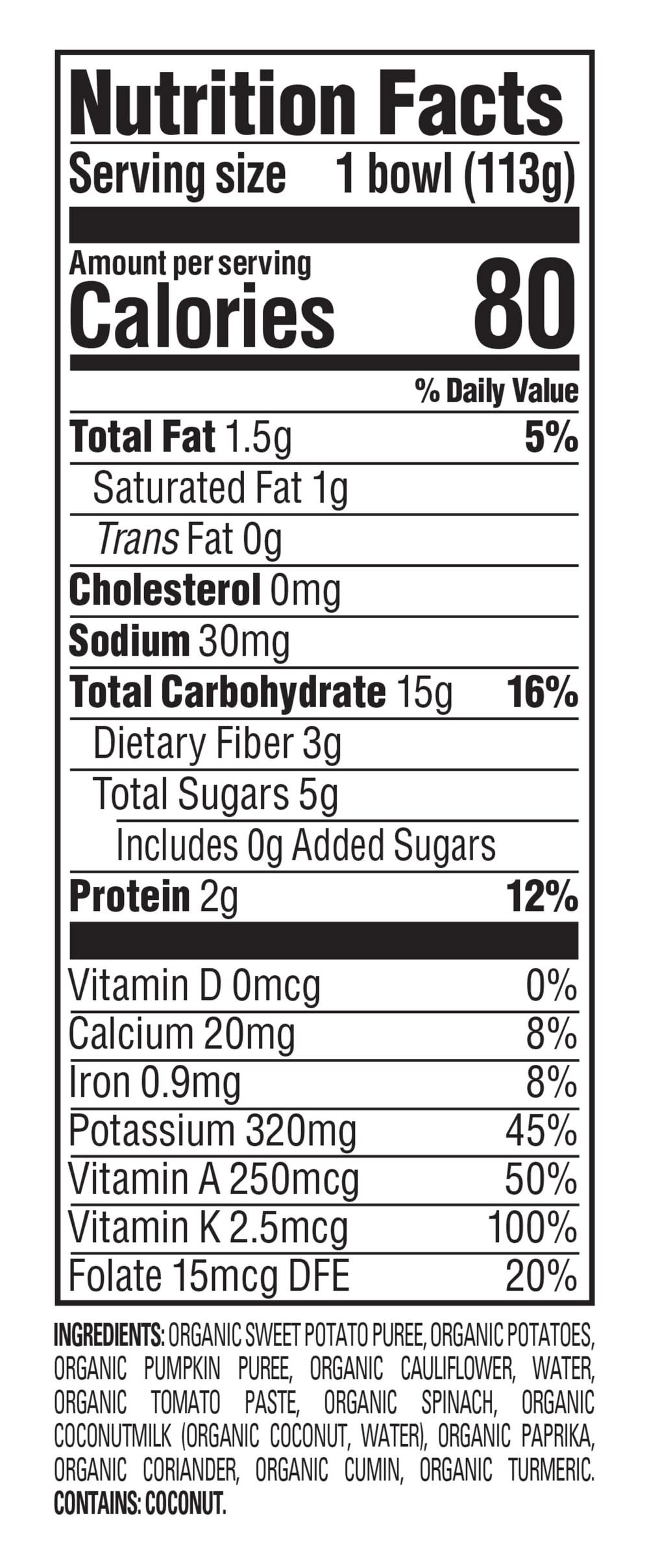Ingredients: ORGANIC SWEET POTATO PUREE, ORGANIC POTATOES, ORGANIC PUMPKIN PUREE, ORGANIC CAULIFLOWER, WATER, ORGANIC TOMATO PASTE, ORGANIC SPINACH, ORGANIC COCONUTMILK (ORGANIC COCONUT, WATER), ORGANIC PAPRIKA, ORGANIC CORIANDER, ORGANIC CUMIN, ORGANIC TURMERIC. Contains: CONTAINS: COCONUT.