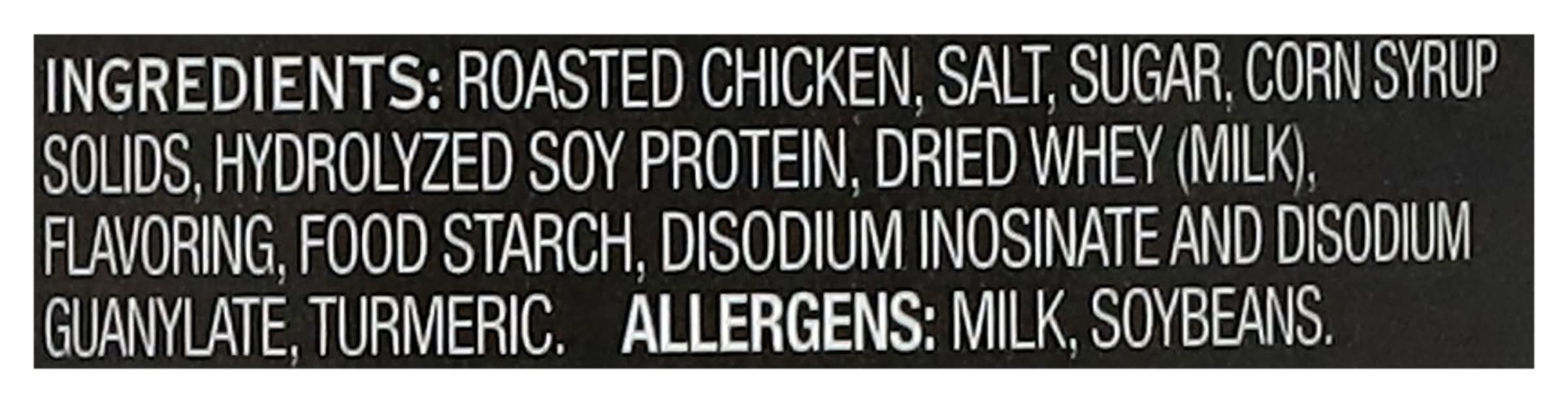 Ingredients: Roasted Chicken, Salt, Sugar, Corn Syrup Solids, Hydrolyzed Soy Protein, Dried Whey (Milk), Flavoring, Food Starch, Disodium Inosinate and Disodium Guanylate, Turmeric Contains: Milk, Soybeans, Corn