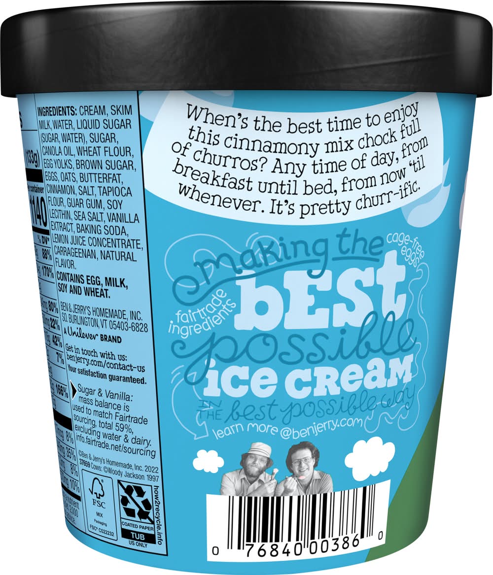 Buttery cinnamon ice cream with churro pieces & crunchy cinnamon swirls. 380 calories per 2/3 cup. Vermont's finest. When's the best time to enjoy this cinnamon mix chock full of churros? Any time of day, from breakfast until bed, from now 'til whenever. It's pretty churr-ific. Making the best possible ice cream in the best possible way. Cage-free eggs. Fairtrade ingredients. Your satisfaction guaranteed. benjerry.com/contact-us. how2recycle.info. Get in touch with us: benjerry.com/contact-us. Learn more (at)benjerry.com. Fair Trade. Sugar & Vanilla: Mass balance is used to match Fairtrade sourcing, total 59%, excluding water & dairy. info.fairtrade.net/sourcing. FSC: Mix - Packaging. • Flavor: Cinnamon • Packaging: Reusable