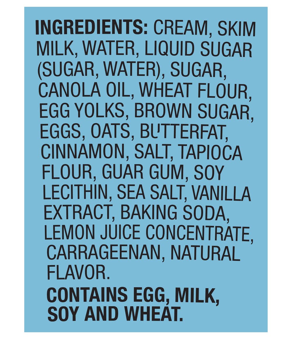 Ingredients: Cream, Skim Milk, Water, Liquid Sugar (Sugar Water), Sugar, Canola Oil, Wheat Flour, Egg Yolks, Brown Sugar, Eggs, Oats, Butterfat, Cinnamon, Salt, Tapioca Flour, Guar Gum, Soy Lecithin, Sea Salt, Vanilla Extract, Baking Soda, Lemon Juice Concentrate, Carrageenan, Natural Flavor Contains: Eggs, Milk, Soybeans, Wheat, Oat