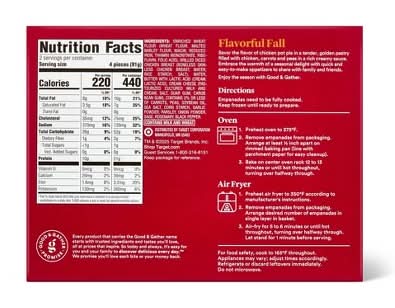 Savor the flavor of chicken pot pie in a tender, golden pastry filled with chicken, carrots and peas in a rich creamy sauce. Embrace with warmth of a seasonal delight with quick and easy-to-make appetizers to share with family and friends. Every product that carries the Good & Gather™ name starts with quality ingredients that deliver great taste, making it easier for you and your family to eat well, every day. We promise you’ll love each bite, or your money back. All Good & Gather products are made without artificial flavors, synthetic colors, artificial sweeteners, and high-fructose corn syrup. Some are specially formulated while others never contained these ingredients.