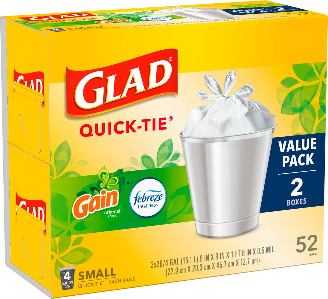 Glad Quick-Tie Gain Original Odor Shield Small 2x26ct • Glad Products, Oakland, CA, 94612 • Packaging: Reusable