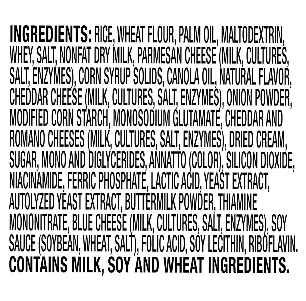 Ingredients: Rice, Wheat Flour, Palm Oil, Maltodextrin, Whey, Salt, Nonfat Dry Milk, Parmesan Cheese (Milk Cultures Salt Enzymes), Corn Syrup Solids, Canola Oil, Natural Flavor, Cheddar Cheese (Milk Cultures Salt Enzymes), Onion Powder, Modified Corn Starch, Monosodium Glutamate, Cheddar and Romano Cheeses (Milk Cultures Salt Enzymes), Dried Cream, Sugar, Mono and Diglycerides, Annatto (Color), Silicon Dioxide, Niacinamide, Ferric Phosphate, Lactic Acid, Yeast Extract, Autolyzed Yeast Extract, Buttermilk Powder, Thiamine Mononitrate, Blue Cheese (Milk Cultures Salt Enzymes), Soy Sauce (Soybean Wheat Salt), Folic Acid, Soy Lecithin, Riboflavin Contains: Wheat, Corn, Milk, Soybeans