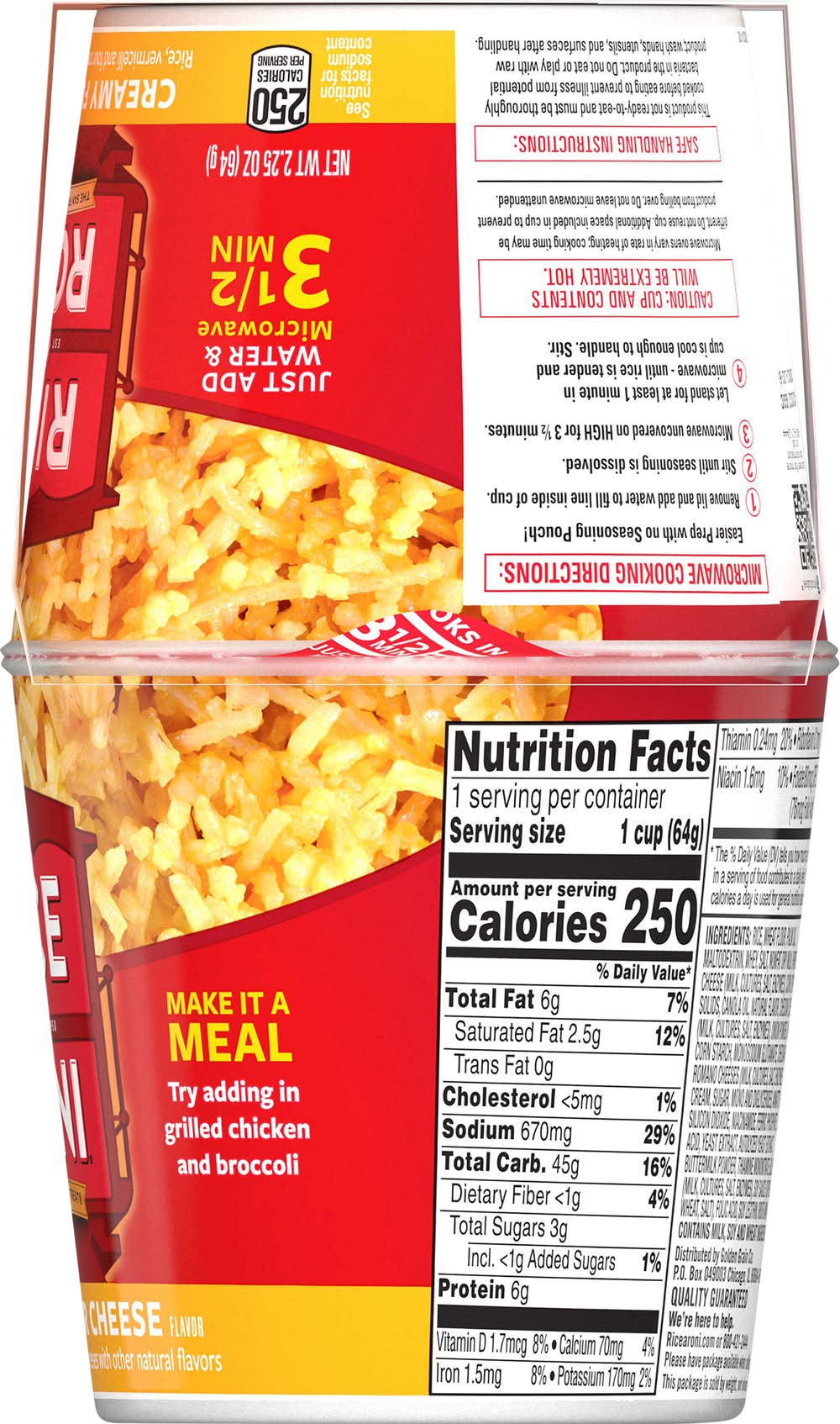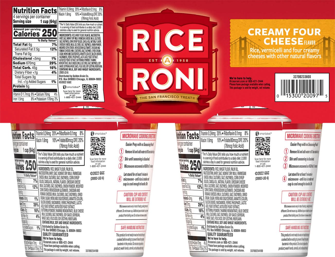 Rice, vermicelli and four creamy cheeses with other natural flavors. Per Serving: 250 calories; 2.5 g sat fat (12% DV); 670 mg sodium (29% DV); 3 g total sugars. See nutrition information for sodium content. Microwave 3 1/2 min. Just add water. Est 1958. The San Francisco treat. Please have package available when calling. This package is sold by weight, not volume. • Flavor: Creamy four cheese • Pack size: 4