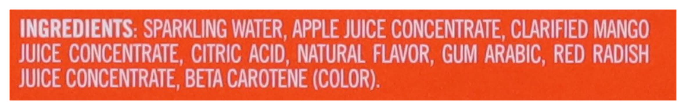 Ingredients: Sparkling Water, Apple Juice Concentrate, Clarified Mango Juice Concentrate, Citric Acid, Natural Flavor, Gum Arabic, Red Radish Juice Concentrate, Beta Carotene (Color)