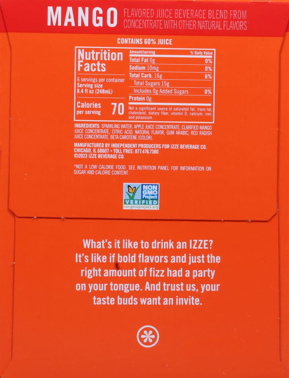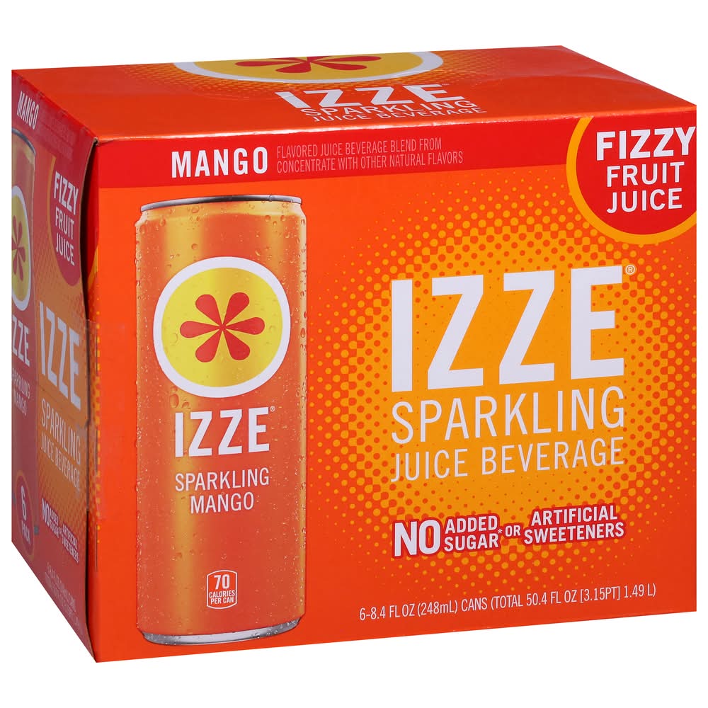 IZZE Mango Sparkling Juice beverage blend is sun-ripe, juicy, bubbly and fizzing awesome! Full of bold flavors and with just the right amount of bubbles, drinking an IZZE is like having a party on your tongue. IZZE combines 60% real fruit juice* with a splash of bubbly H2O. At any time of day, celebrate and elevate your beverage experience with flavors ranging from peach to blackberry, pomegranate to apple and more. Ideal for get-togethers with family and friends, the fusion of real fruit flavors and sparkling water creates an irresistibly bold taste that sets IZZE apart. Another plus – it’s non-GMO, has no added sugar** and no artificial sweeteners. Packed with powerfully fruity taste, each 8.4 FL OZ can has 70 calories.The fabulous drink that is IZZE was born in blue-sky Boulder, Colorado. When two best friends were taking a break and having a beverage, they wondered why soda couldn’t be a bit more sophisticated. They wanted more – something that was fizzy and fun and made with real juice.* Something that would lift you up and not weigh you down with extras you don’t want. So they came up with IZZE, and the rest, as they say, is fizz-story.*Juice beverage blend from concentrate**Not a low calorie food. See nutrition information for sugar and calorie content. • Flavor: Mango • Pack size: 6 • Packaging: Reusable