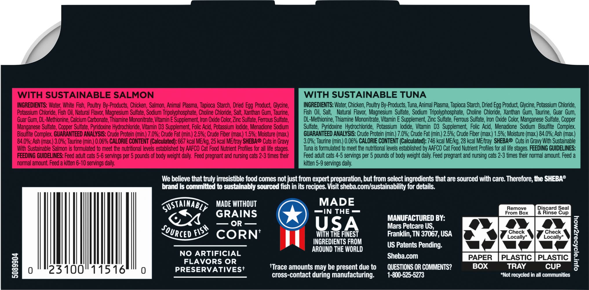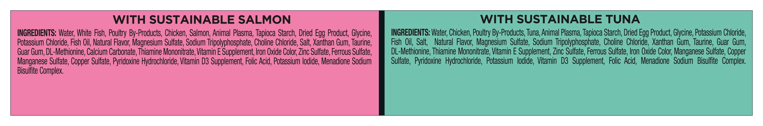Ingredients: With Sustainable Salmon: Water, White Fish, Poultry By-Products, Chicken, Salmon, Animal Plasma, Tapioca Starch, Dried Egg Product, Glycine, Potassium Chloride, Fish Oil, Natural Flavor, Magnesium Sulfate, Sodium Tripolyphosphate, Choline Chloride, Salt, Xanthan Gum, Taurine, Guar Gum, DL-Methionine, Calcium Carbonate, Thiamine Mononitrate, Vitamin E Supplement, Iron Oxide Color, Zinc Sulfate, Ferrous Sulfate, Manganese Sulfate, Copper Sulfate, Pyridoxine Hydrochloride, Vitamin D3 Supplement, Folic Acid, Potassium Iodide, Menadione Sodium Bisulfite Complex. With Sustainable Tuna: Water, Chicken, Poultry By-Products, Tuna, Animal Plasma, Tapioca Starch, Dried Egg Product, Glycine, Potassium Chloride, Fish Oil, Salt, Natural Flavor, Magnesium Sulfate, Sodium Tripolyphosphate, Choline Chloride, Xanthan Gum, Taurine, Guar Gum, DL-Methionine, Thiamine Mononitrate, Vitamin E Supplement, Zinc Sulfate, Ferrous Sulfate, Iron Oxide Color, Manganese Sulfate, Copper Sulfate, Pyridoxine Hydrochloride, Potassium Iodide, Vitamin D3 Supplement, Folic Acid, Menadione Sodium Bisulfite Complex Contains: Fish, Salmon, Fish, Sulfites, Fish, Tuna, Eggs