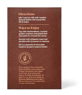 Treat yourself to a delectable sip with a mug of Double Chocolate Hot Cocoa Mix from Good & Gather. Made with premium cocoa for a rich, indulgent sipping experience, this double chocolate mix has a decadent taste profile that will have you feeling cozy in an instant. Individual packets make portioning and prep a breeze, and each box includes eight packets so you'll have plenty on hand. Just add milk and top with a dollop of whipped cream and a dash of cinnamon for sweet way to start the day or wind down in the evening. Every product that carries the Good & Gather name starts with quality ingredients that deliver great taste, making it easier for you and your family to eat well, every day. We promise you’ll love each bite, or your money back. • Flavor: Double chocolate • Packaging: Reusable