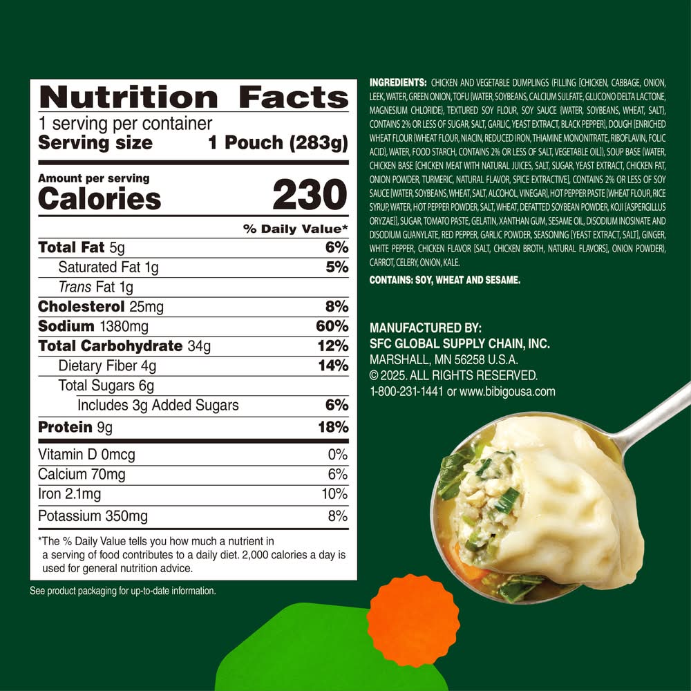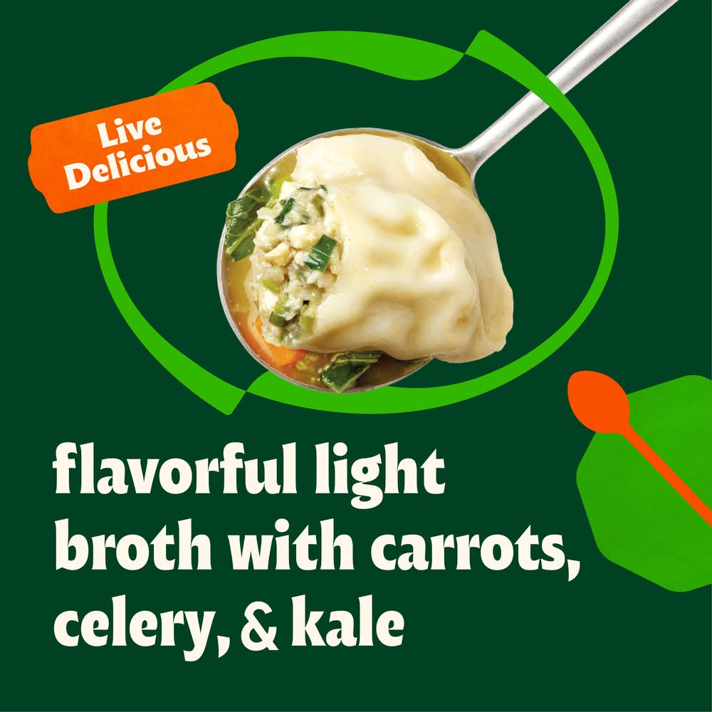 Ingredients: INGREDIENTS: CHICKEN AND VEGETABLE DUMPLINGS (FILLING [CHICKEN, CABBAGE, ONION, LEEK, WATER, GREEN ONION, TOFU {WATER, SOYBEANS, CALCIUM SULFATE, GLUCONO DELTA LACTONE, MAGNESIUM CHLORIDE}, TEXTURED SOY FLOUR, SOY SAUCE {WATER, SOYBEANS, WHEAT, SALT}, CONTAINS 2% OR LESS OF SUGAR, SALT, GARLIC, YEAST EXTRACT, BLACK PEPPER], DOUGH [ENRICHED WHEAT FLOUR {WHEAT FLOUR, NIACIN, REDUCED IRON, THIAMINE MONONITRATE, RIBOFLAVIN, FOLIC ACID}, WATER, FOOD STARCH, CONTAINS 2% OR LESS OF SALT, VEGETABLE OIL]), SOUP BASE (WATER, CHICKEN BASE [CHICKEN MEAT WITH NATURAL JUICES, SALT, SUGAR, MALTODEXTRIN, YEAST EXTRACT, CHICKEN FAT, ONION POWDER, TURMERIC, NATURAL FLAVOR, SPICE EXTRACTIVE], CONTAINS 2% OR LESS OF SOY SAUCE [WATER, SOYBEANS, WHEAT, SALT, ALCOHOL, VINEGAR], HOT PEPPER PASTE [WHEAT FLOUR, RICE SYRUP, WATER, HOT PEPPER POWDER, SALT, WHEAT, DEFATTED SOYBEAN POWDER, DISTILLED ALCOHOL, WHEAT KOJI {ASPERGILLUS ORYZAE}], SUGAR, TOMATO PASTE, GELATIN, XANTHAN GUM, SESAME OIL, DISODIUM INOSINATE AND DISODIUM GUANYLATE, RED PEPPER, GARLIC POWDER, SEASONING [YEAST EXTRACT, SALT], GINGER, WHITE PEPPER, CHICKEN FLAVOR [SALT, CHICKEN BROTH, NATURAL FLAVORS], ONION POWDER), CARROT, CELERY, ONION, KALE. Contains: Wheat, Soy, Sesame