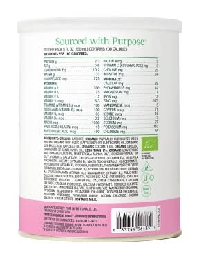 Ingredients: Organic Lactose, Organic Partially Hydrolyzed Whey Protein, Organic High Oleic (Safflower or Sunflower) Oil, Organic Low Erucic Acid Rapeseed Oil, Organic Coconut Oil, Organic Linoleic (Safflower or Sunflower) Oil, Less than 1%: Organic Low Erucic Acid Rapeseed Lecithin, Mortierella Alpina Oil**, Schizochytrium Sp, Oil***, Vitamin A Palmitate, Cholecalciferol (Vitamin D3), DL-Alpha Tocopheryl Acetate (Vitamin E), Mixed Tocopherols Concentrate, Phytonadione (Vitamin K), Ascorbyl Palmitate, Thiamine Hydrochloride (Vitamin B,), Riboflavin (Vitamin B2), Pyridoxine Hydrochloride (Vitamin B6), Cyanocobalamin (Vitamin B12), Niacinamide (Vitamin B3, Folic Acid, Calcium Pantothenate, Biotin, Ascorbic Acid (Vitamin C), Choline Bitartrate, Inositol, L-Carnitine, Calcium Carbonate, Calcium Chloride, Calcium Hydroxide, Calcium Phosphate, Ferrous Sulfate, Zinc Sulfate, Manganese Sulfate, Cupric Sulfate, Magnesium Chloride, Potassium Bicarbonate, Potassium Chloride, Potassium Phosphate, Potassium Hydroxide, Potassium Iodide, Sodium Chloride, Sodium Selenite, Sodium Citrate. ** a Source of Arachidonic Acid (ARA). *** a Source of Docosahexaenoic Acid (DHA).