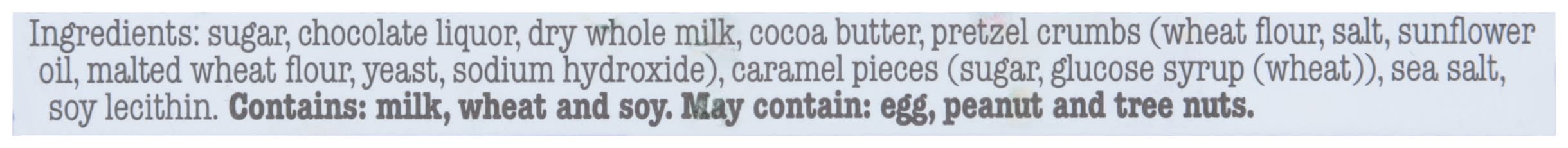 Ingredients: Sugar, Chocolate Liquor, Dry Whole Milk, Cocoa Butter, Pretzel Crumbs (Wheat Flour, Salt, Sunflower Oil, Malted Wheat Flour, Yeast, Sodium Hydroxide), Caramel Pieces (Sugar, Glucose Syrup (Wheat)), Sea Salt, Soy Lecithin Contains: Milk, Wheat, Soybeans, Eggs, Peanuts, Tree nuts