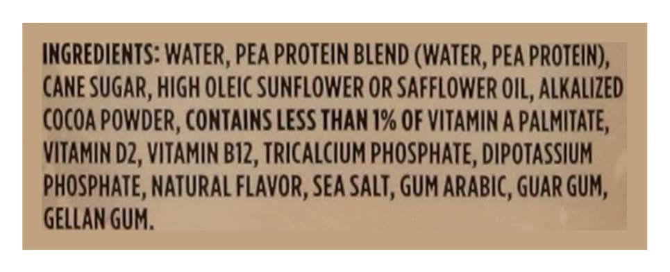 Ingredients: Water, Pea Protein Blend (Water, Pea Protein), Cane Sugar, High Oleic Sunflower or Safflower Oil, Alkalized Cocoa Powder, Contains Less than 1% of Vitamin A Palmitate, Vitamin D2, Vitamin B12, Tricalcium Phosphate, Dipotassium Phosphate, Natural Flavor, Sea Salt, Gum Arabic, Guar Gum, Gellan Gum
