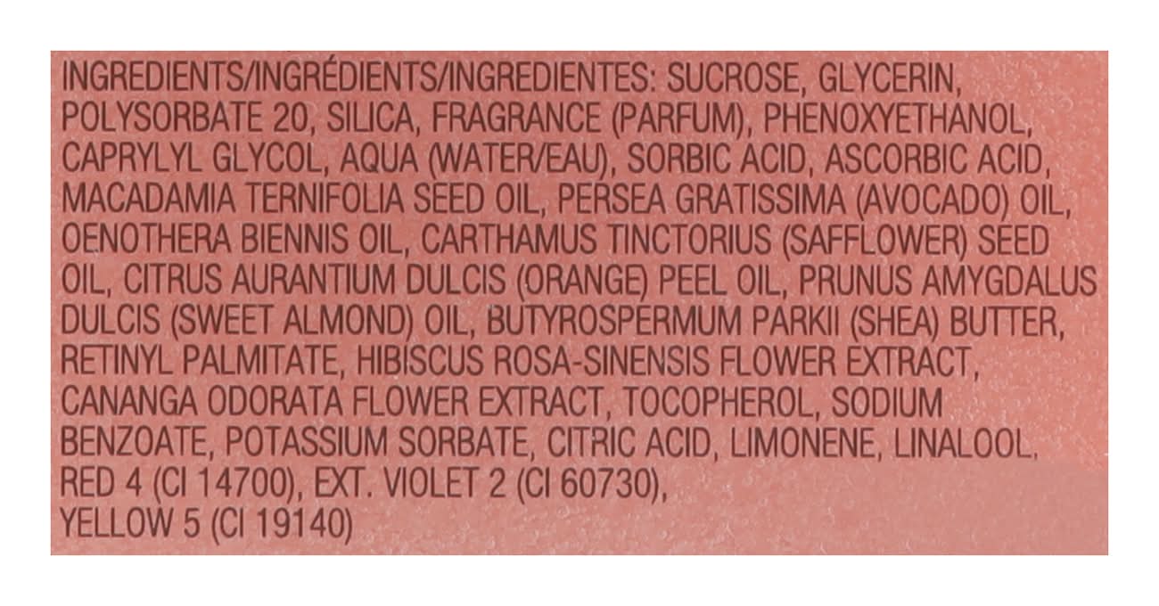 Ingredients: Sucrose, Glycerin, Polysorbate 20, Silica, Hibiscus Rosa-Sinensis Flower Extract, Cananga Odorata Flower Extract, Leuconostoc/Radish Root Ferment Filtrate, Prunus Amygdalus Dulcis (Sweet Almond) Oil, Persea Gratissima (Avocado) Oil, Carthamus Tinctorius (Safflower) Seed Oil, Oenothera Biennis (Evening Primrose) Oil, Macadamia Ternifolia Seed Oil, Citrus Aurantium Dulcis (Orange) Oil, Butyrospermum Parkii (Shea) Butter, Caprylyl Glycol, Aqua (Water/Eau), Ascorbic Acid, Phenoxyethanol, Sorbic Acid, Retinyl Palmitate, Limonene, Linalool, Benzyl Salicylate, Benzyl Benzoate, Fragrance (Parfum), CI 14700 (Red 4), CI 60730 (Ext. Violet 2), 19140 (Yellow 5) Contains: Tree Nuts, Almonds, Tree Nuts, Macadamia Nuts
