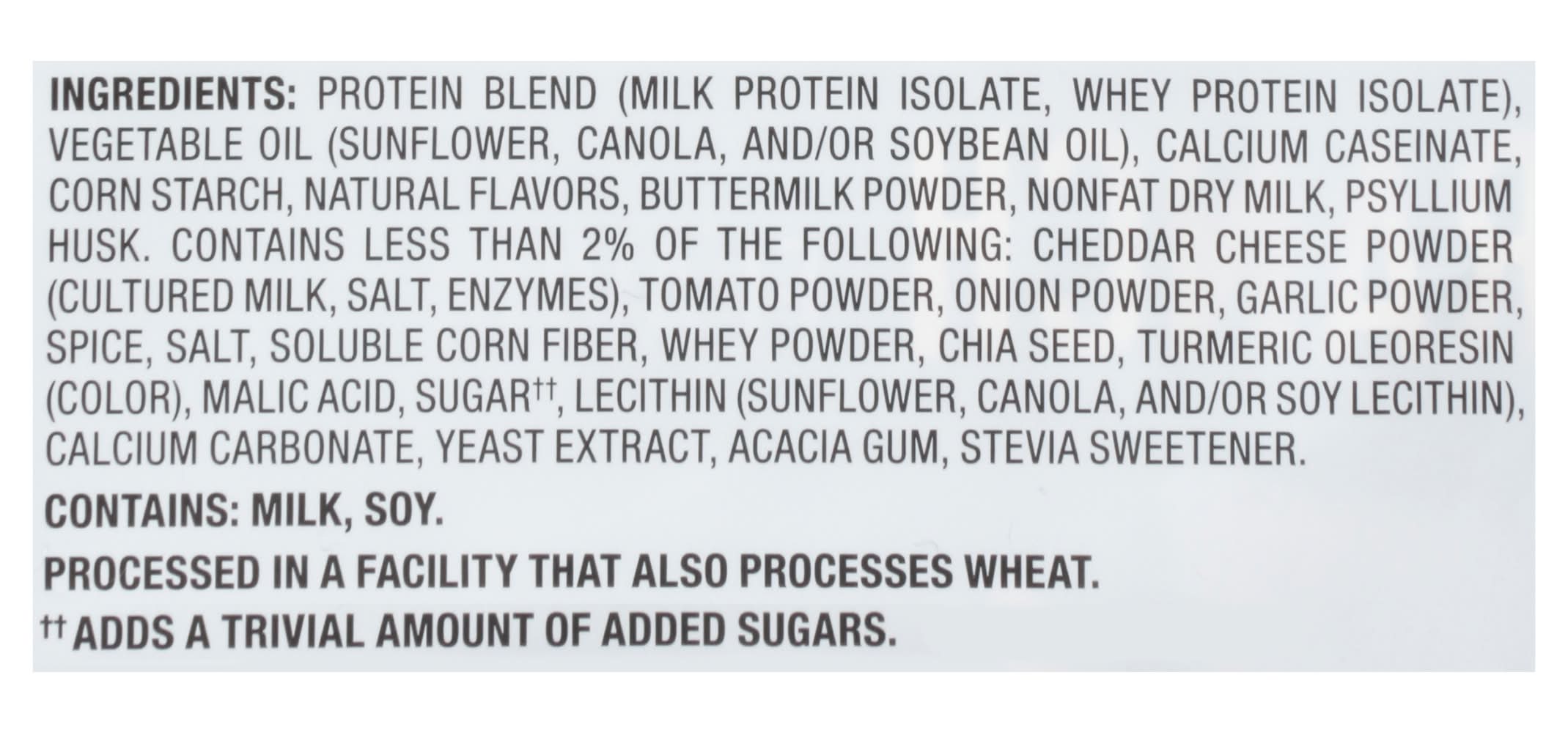 Ingredients: Protein Blend (Milk Protein Isolate, Whey Protein Isolate), Vegetable Oil (Sunflower, Canola, and/or Soybean Oil), Calcium Caseinate, Corn Starch, Natural Flavors, Buttermilk Powder, Nonfat Dry Milk, Psyllium Husk, Contains Less than 2% of the Following: Cheddar Cheese Powder (Cultured Milk, Salt, Enzymes), Tomato Powder, Onion Powder, Garlic Powder, Spice, Salt, Soluble Corn Fiber, Whey Powder, Chia Seed, Turmeric Oleoresin (Color), Malic Acid, Sugar (Adds a Trivial Amount of Added Sugars), Lecithin (Sunflower, Canola, and/or Soy Lecithin), Calcium Carbonate, Yeast Extract, Acacia Gum, Stevia Sweetener Contains: Milk, Soybeans, Corn, Wheat