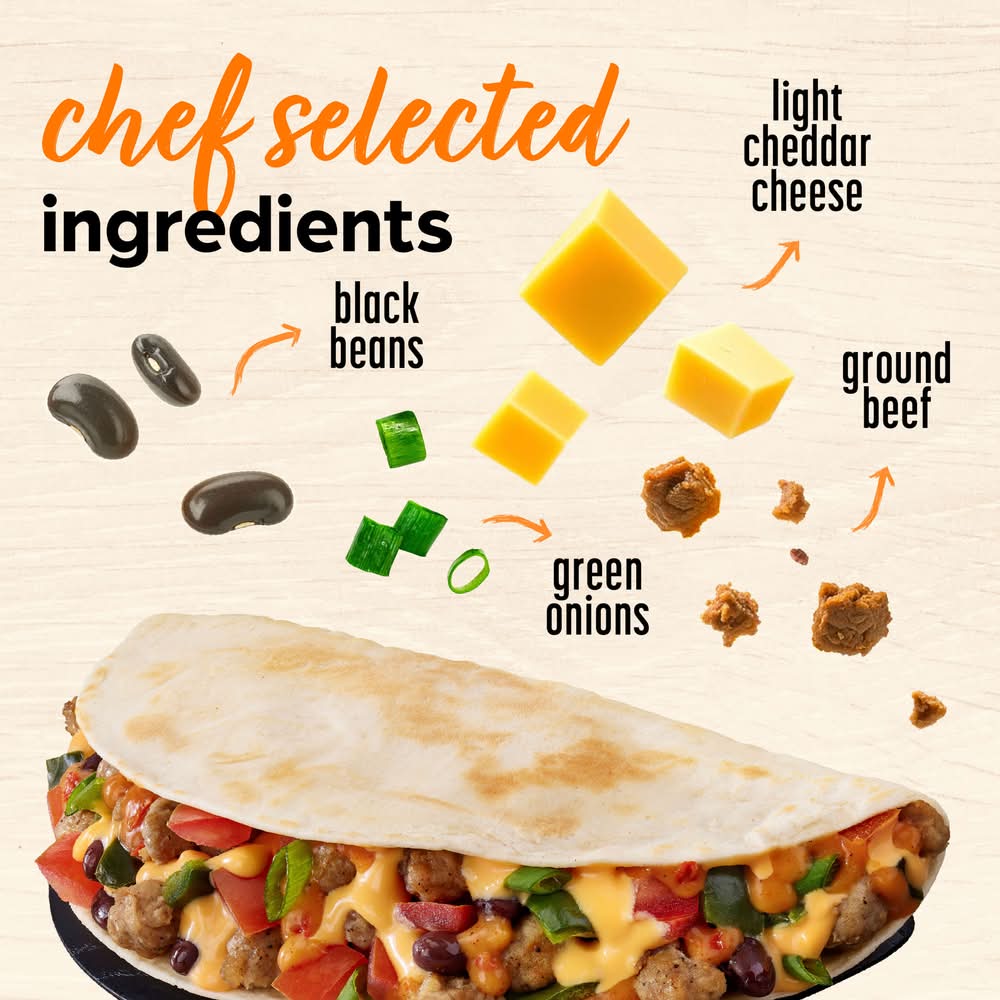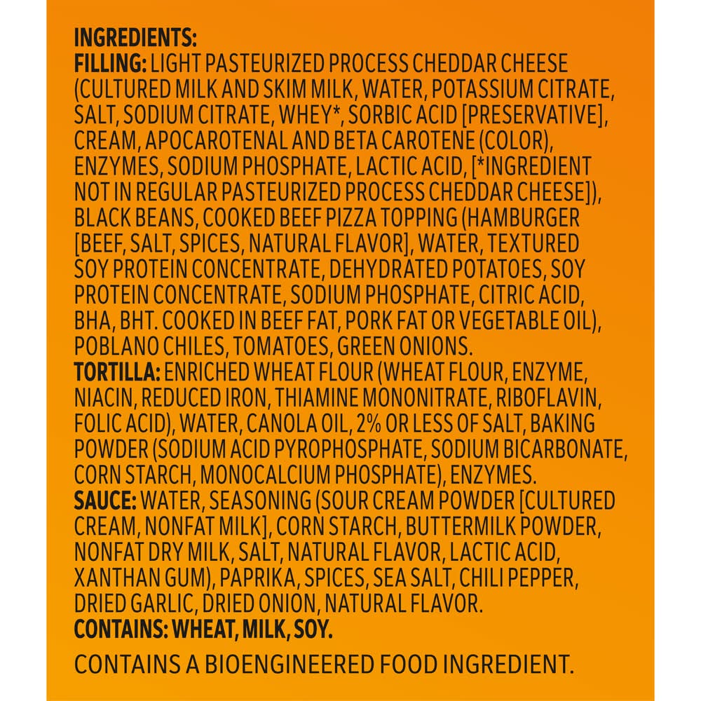 Ingredients: FILLING: LIGHT PASTEURIZED PROCESS CHEDDAR CHEESE (CULTURED MILK AND SKIM MILK, WATER, POTASSIUM CITRATE, SALT, SODIUM CITRATE, WHEY*, SORBIC ACID [PRESERVATIVE], CREAM, APOCAROTENAL AND BETA CAROTENE [COLOR], ENZYMES, SODIUM PHOSPHATE, LACTIC ACID, [*INGREDIENT NOT IN REGULAR PASTEURIZED PROCESS CHEDDAR CHEESE]), BLACK BEANS, COOKED BEEF PIZZA TOPPING (HAMBURGER [BEEF, SALT, SPICES, NATURAL FLAVOR], WATER, TEXTURED SOY PROTEIN CONCENTRATE, DEHYDRATED POTATOES, SOY PROTEIN CONCENTRATE, SODIUM PHOSPHATE, CITRIC ACID, BHA, BHT. COOKED IN BEEF FAT, PORK FAT OR VEGETABLE OIL), POBLANO CHILES, TOMATOES, GREEN ONIONS. TORTILLA: ENRICHED WHEAT FLOUR (WHEAT FLOUR, ENZYME, NIACIN, REDUCED IRON, THIAMINE MONONITRATE, RIBOFLAVIN, FOLIC ACID), WATER, CANOLA OIL, 2% OR LESS OF SALT, BAKING POWDER (SODIUM ACID PYROPHOSPHATE, SODIUM BICARBONATE, CORN STARCH, MONOCALCIUM PHOSPHATE), ENZYMES. SAUCE: WATER, SEASONING (SOUR CREAM POWDER [CULTURED CREAM, NONFAT MILK], CORN STARCH, BUTTERMILK POWDER, NONFAT DRY MILK, SALT, NATURAL FLAVOR, LACTIC ACID, XANTHAN GUM), PAPRIKA, SPICES, SEA SALT, CHILI PEPPER, DRIED GARLIC, DRIED ONION, NATURAL FLAVOR. Contains: CONTAINS: WHEAT, MILK, SOY.