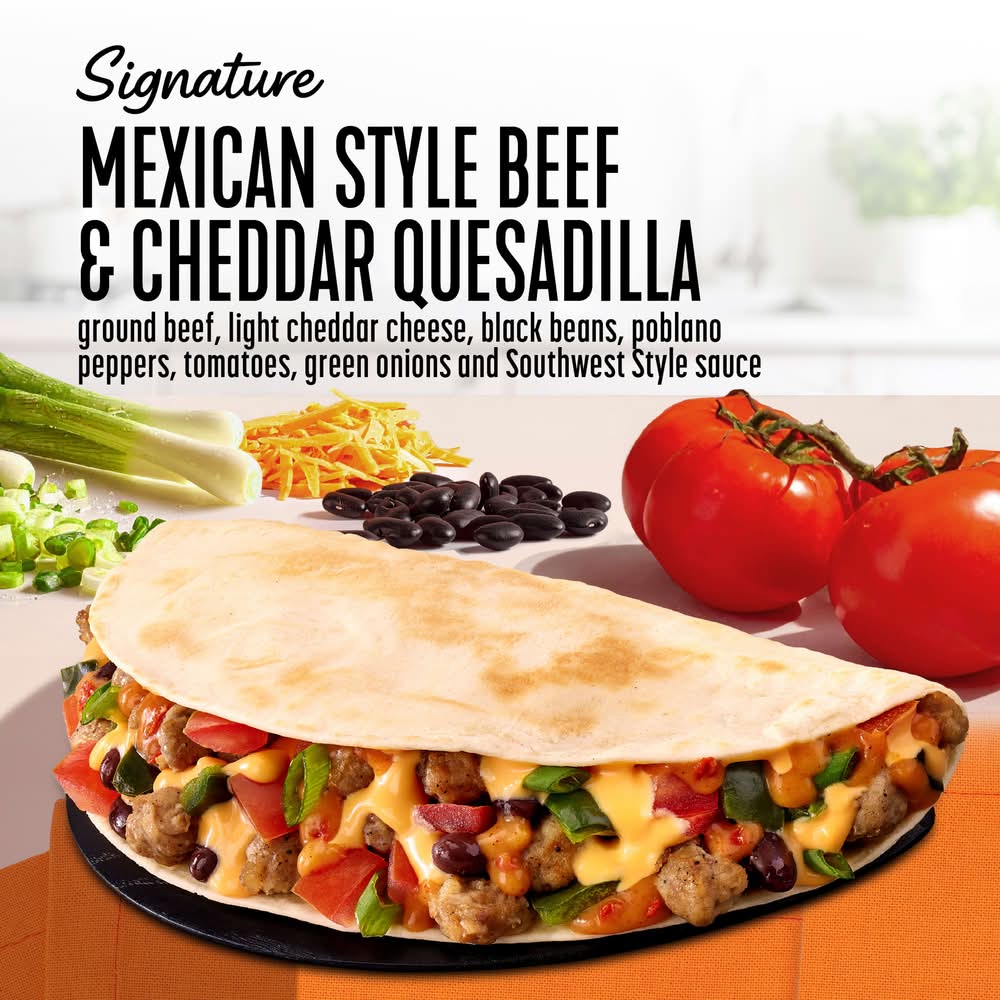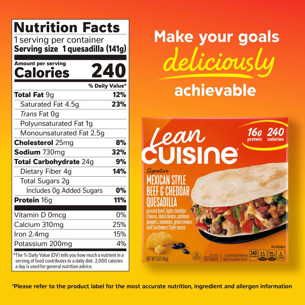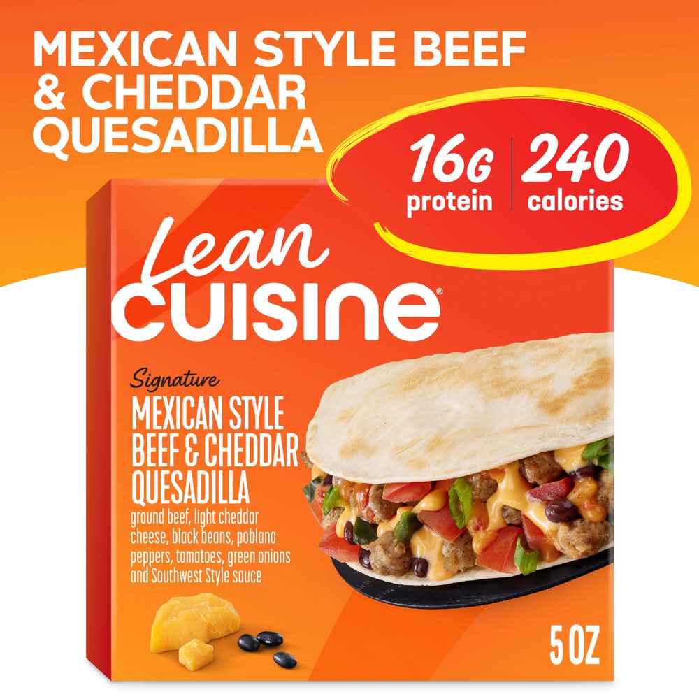 Progress never tasted this good -- Lean Cuisine Mexican Style Beef & Cheddar Quesadilla is a quick, satisfying option for busy weeknights. This frozen meal features ground beef, light cheddar cheese, black beans, poblano peppers, tomatoes, green onions and southwest style sauce for real comfort you can feel good about. Whenever you're searching for perfectly portioned meals that fit into your routine, think of Lean Cuisine frozen dinner. Whether you're stocking up on convenient frozen dinners or looking for diet food that fits your meal plan goals, Lean Cuisine makes it easy to stay on track. These frozen single meals have 16g of protein, making them a great option to help hit your macros. Simply microwave and enjoy — no prep, no cleanup, just smart eating made simple. Flavor: Beef & cheddar