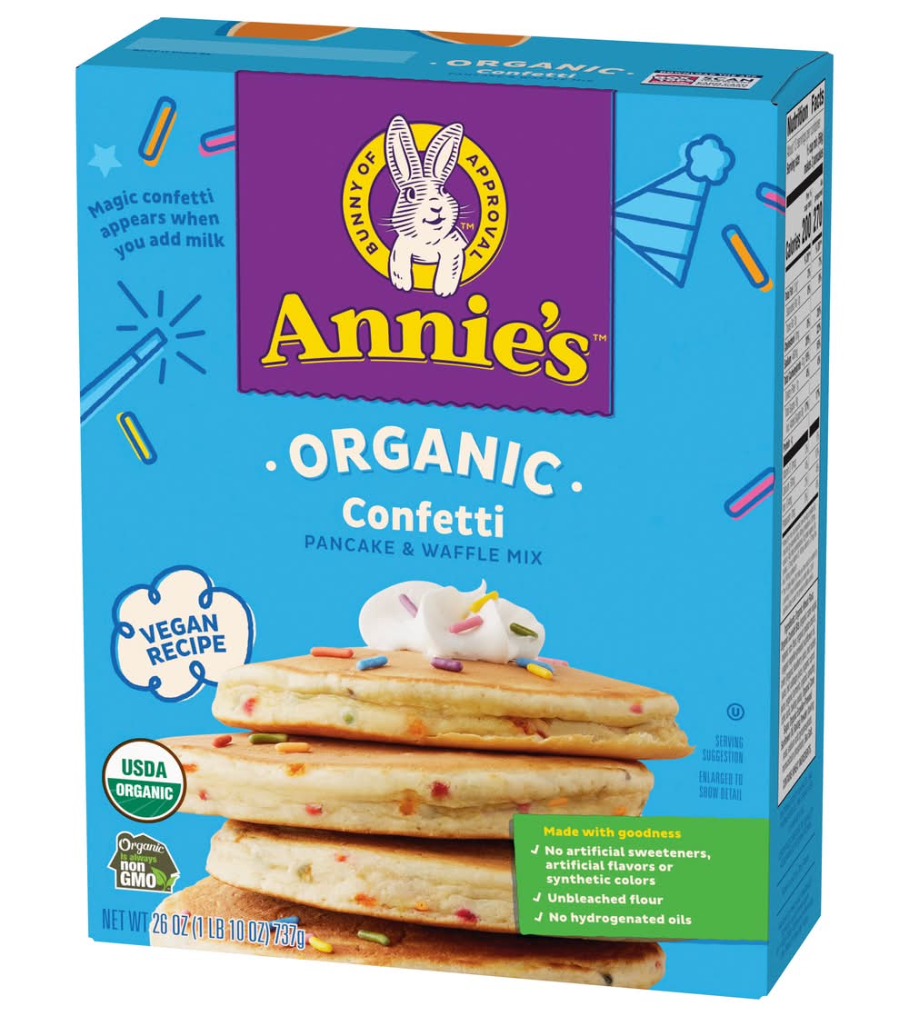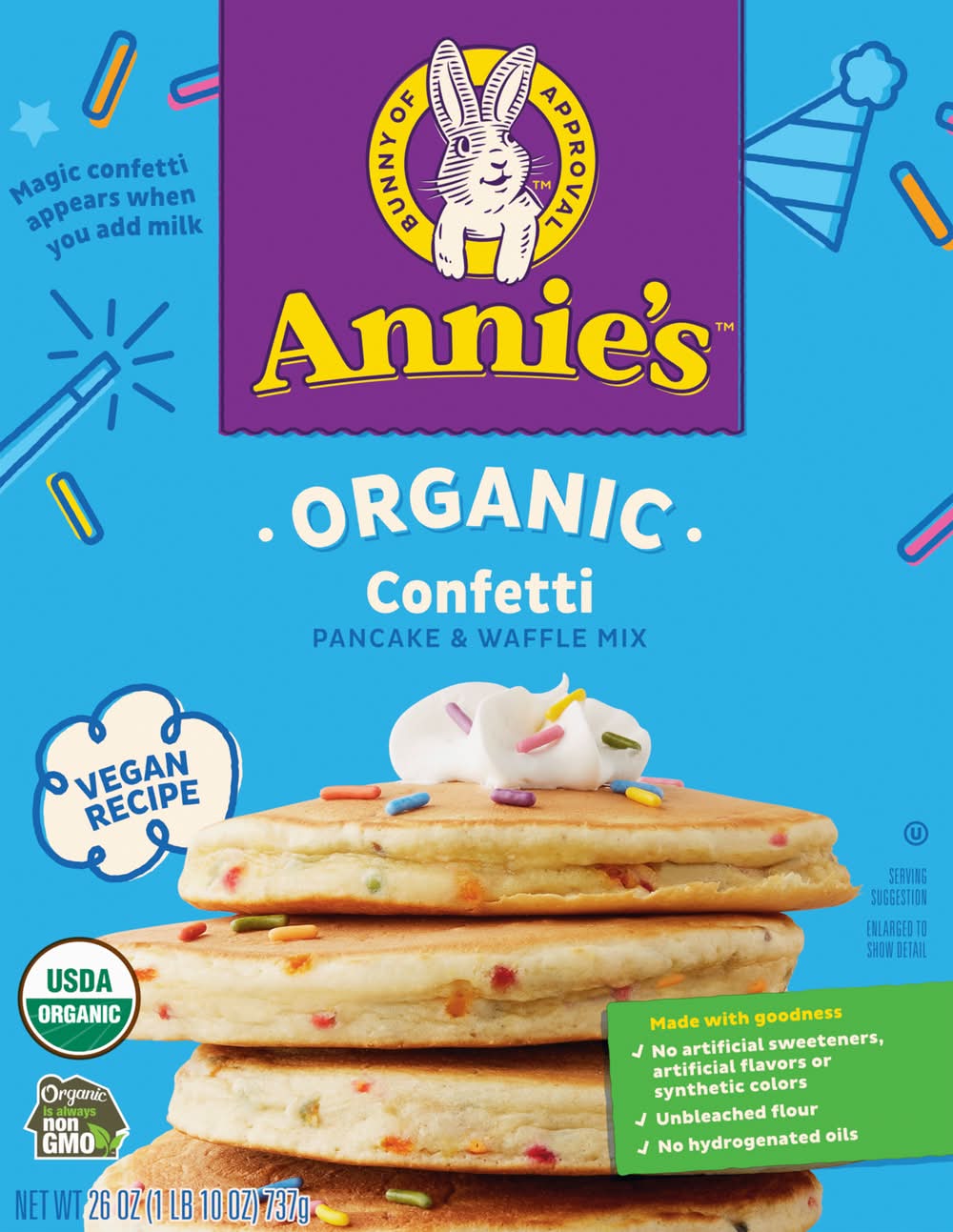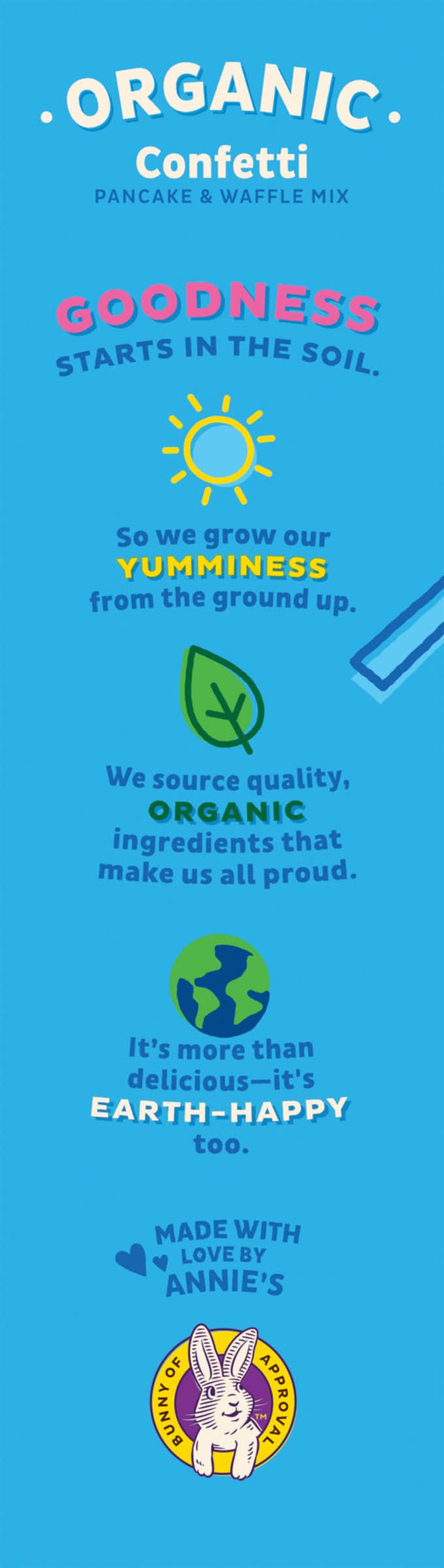 Organic Confetti Pancake & Waffle Mix • Number of servings: 13 • Annie's, Inc., Minneapolis, MN, 55440, Ph: 800-288-1089 • Packaging: Reusable