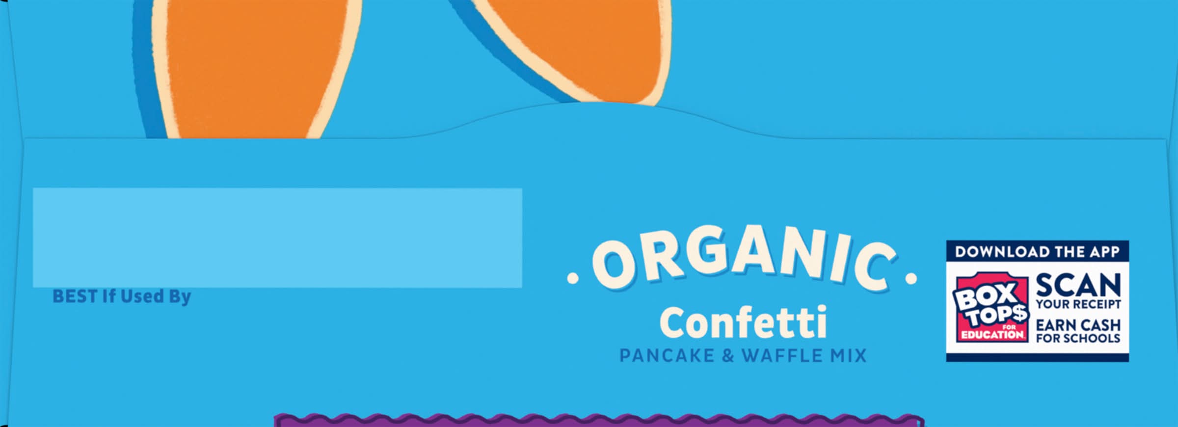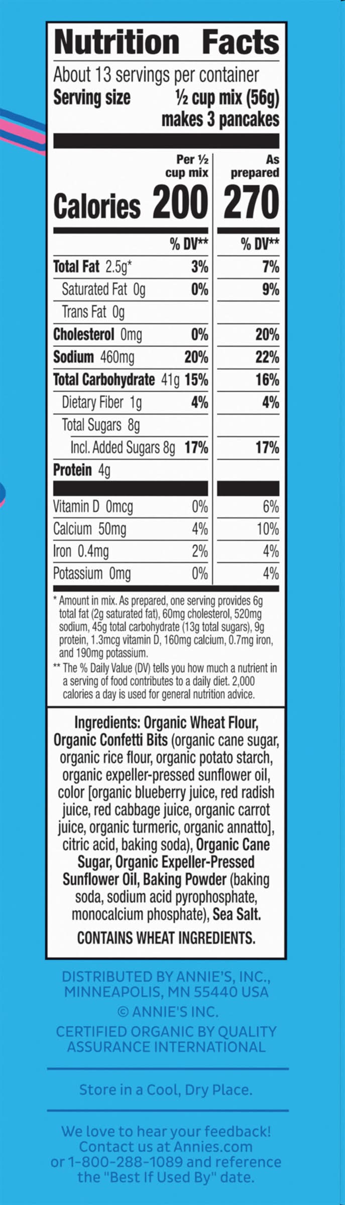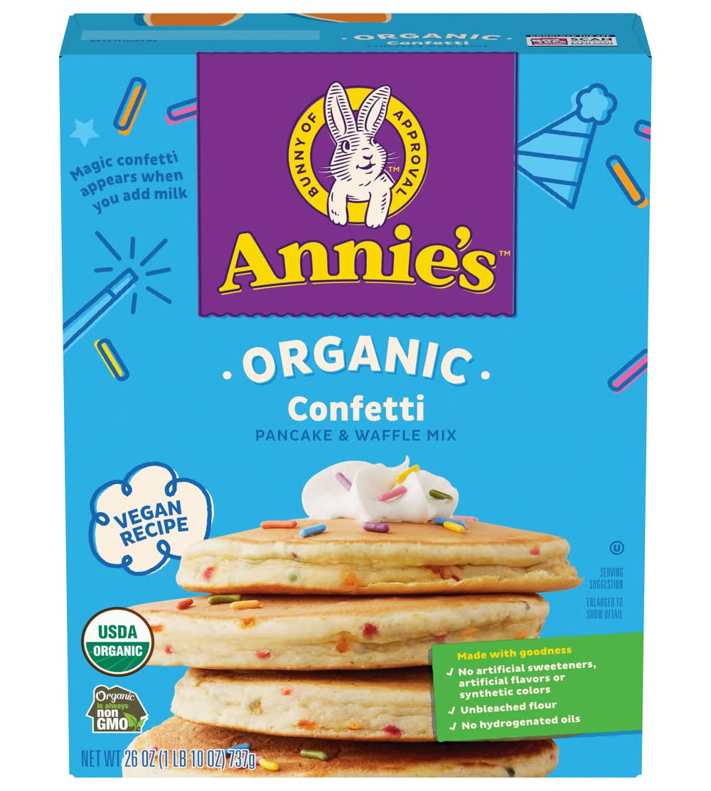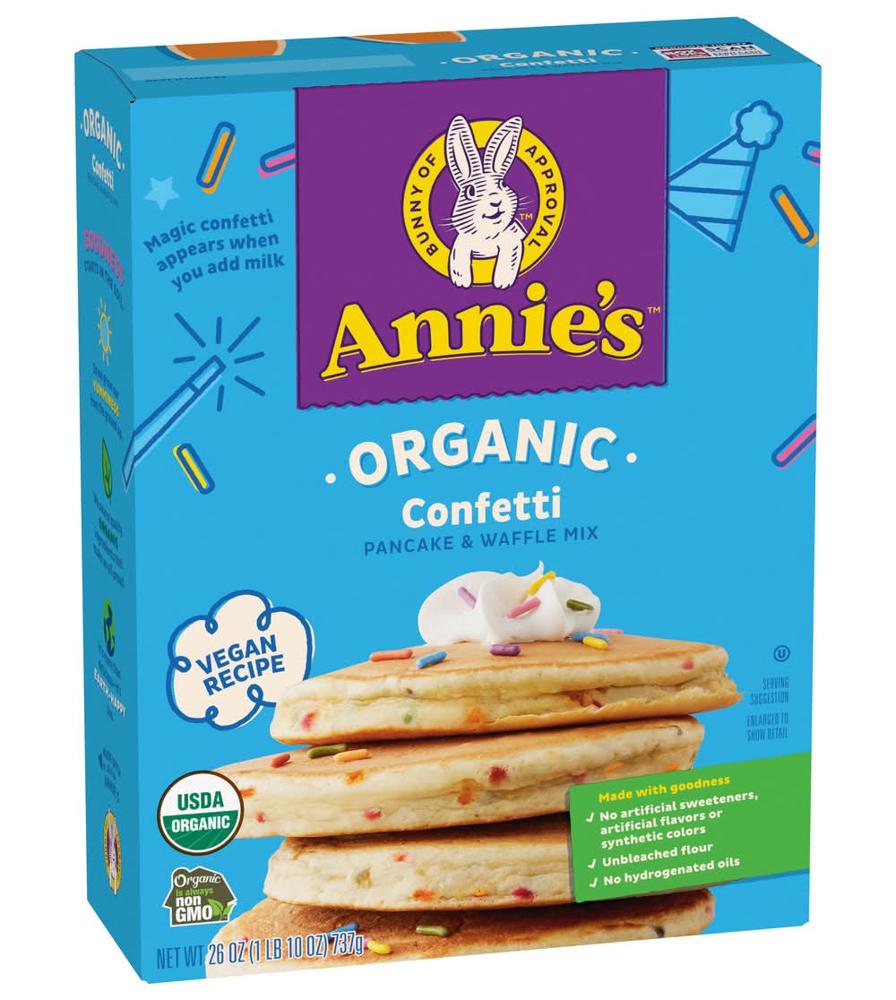 Organic Confetti Pancake & Waffle Mix • Number of servings: 13 • Annie's, Inc., Minneapolis, MN, 55440, Ph: 800-288-1089 • Packaging: Reusable