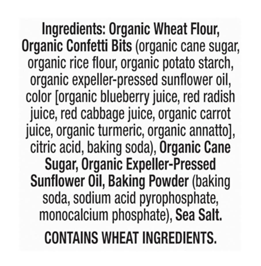 Ingredients: Organic Wheat Flour, Organic Confetti Bits (Organic Cane Sugar, Organic Rice Flour, Organic Potato Starch, Organic Expeller-Pressed Sunflower Oil, Color [Organic Blueberry Juice, Red Radish Juice, Red Cabbage Juice, Organic Carrot Juice, Organic Turmeric, Organic Annatto], Citric Acid, Baking Soda), Organic Cane Sugar, Organic Expeller-Pressed Sunflower Oil, Baking Powder (Baking Soda, Sodium Acid Pyrophosphate, Monocalcium Phosphate), Sea Salt Contains: Wheat