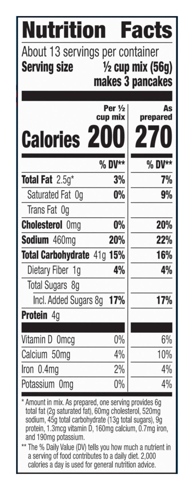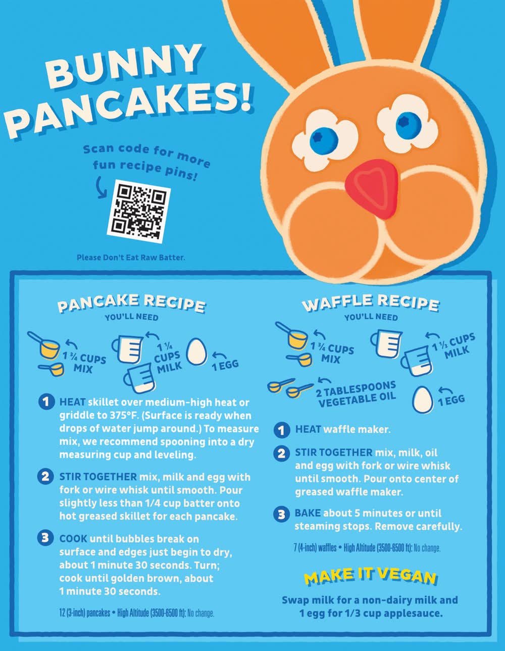 Directions for use: Pancake Recipe: You’ll need: 1- 3/4 cups mix, 1 cup milk, 1 egg. (1) Heat skillet over medium-high heat or griddle to 375 degrees F. (Surface is ready when drops of water jump around.) To measure ix, we recommend spooning into a dry measuring cup and leveling. (2) Stir together mix, milk and egg with fork or wire whisk until smooth. Pour slightly less than 1/4 cup batter onto greased skillet for each pancake. (3) Cook until bubbles break on surface and edges just begin to dry, about 1 minute 30 seconds. Turn; cook until golden brown, about 1 minute 30 seconds. 12 (3-1/2-inch) pancakes. High altitude (3500-6500 ft): No change. Waffle Recipe: You’ll need 1-3/4 cups mix, 1-1/3 cups milk, 2 tablespoons vegetable oil, 1 egg. (1) Heat waffle maker. (2) Stir together mix, milk, oil and egg with fork or wire whisk until smooth. Pour onto center of greased waffle maker. (3) Bake about 5 minutes or until steaming stops. Remove carefully. 7 (4-inch) waffles. High altitude (3500-6500 ft): No change. Store in a cool, dry place. Storage recommendation: Store in a cool, dry place.