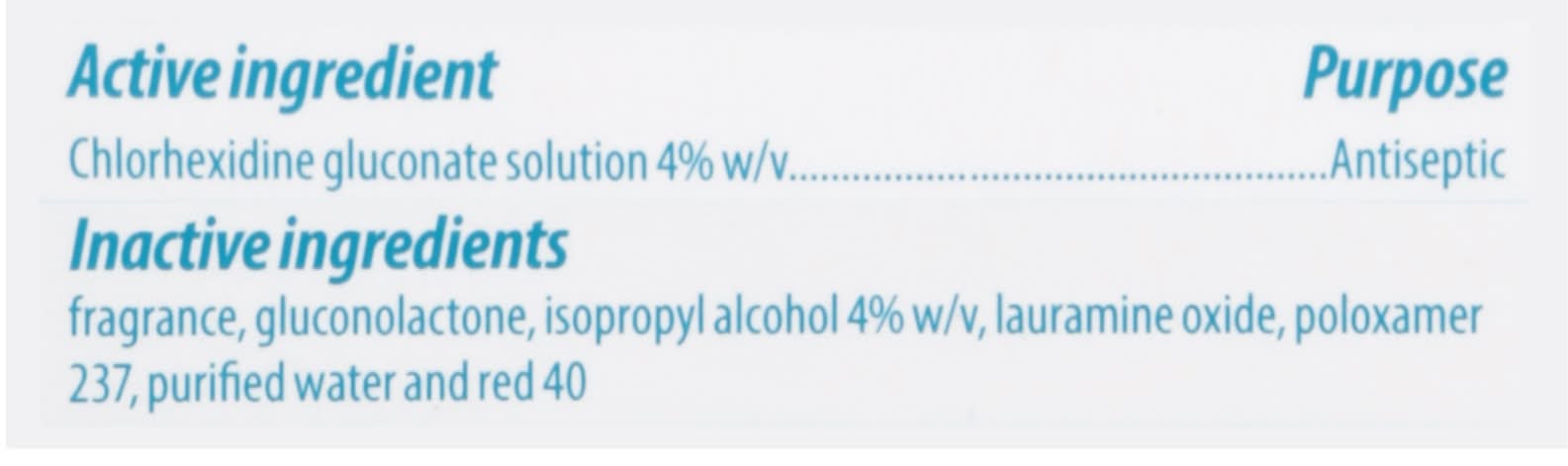 Ingredients: Active Ingredients: Chlorhexidine Gluconate Solution (4 %), Antiseptic. Inactive Ingredients: Fragrance, Gluconolactone, Isopropyl Alcohol 4% w/v, Lauramine Oxide, Poloxamer 237, Purified water and Red 40
